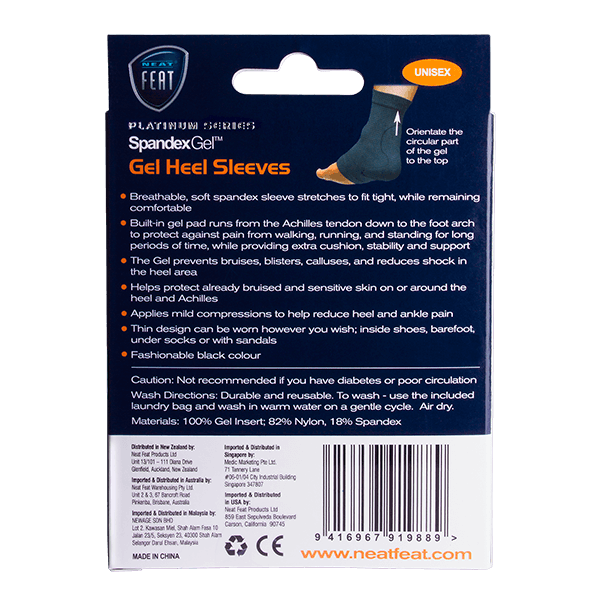 Spandex Gel Heel Sleeves are held in place by a soft, stretchy, comfortable, yet thin and breathable spandex with built-in gel pad running from the Achillies tendon down to the foot arch.