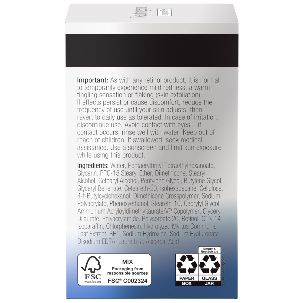 As with any retinol product, it is normal to temporarily experience mild redness, a warm, tingling sensation, or flaking (skin exfoliation). If effects persist or cause discomfort, reduce the frequency of use until your skin adjusts, then revert to daily use as tolerated. In case of irritation, discontinue use. Avoid contact with eyes - if contact occurs, rinse well with water. Keep out of reach of children. If swallowed, seek medical assistance. Use sunscreen and limit sun exposure while using this product.