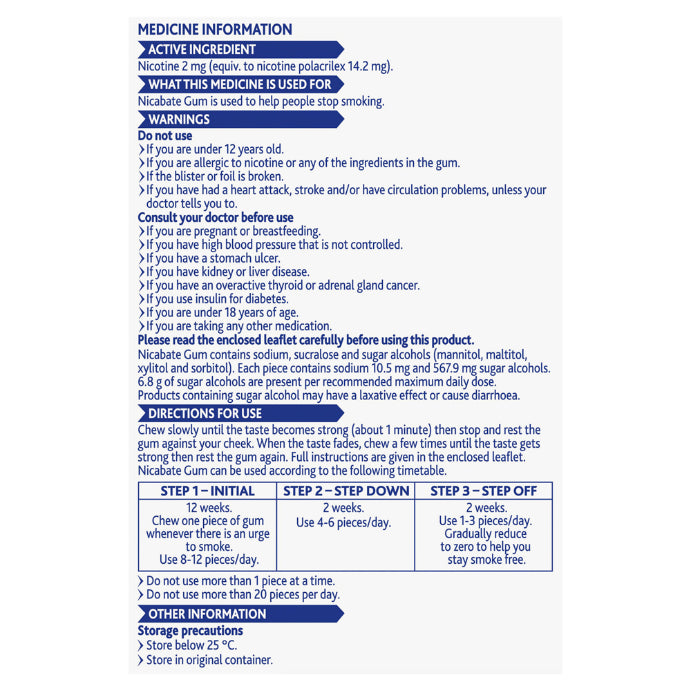 Nicabate Gum contain nicotine to relieve cravings. Craving control that allows you to quit smoking one cigarette at a time, at a pace that suits you, to help you stay calm, be prepared and in control of your quit journey.