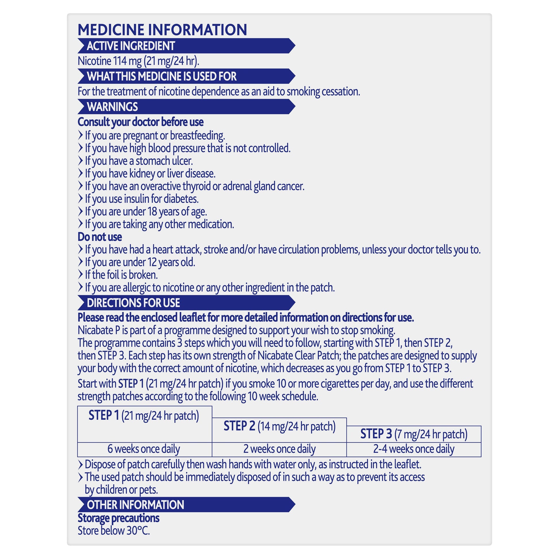 Apply one patch to the skin once a day, preferably on waking. Nicabate Patches are intended to be used for 24 hours but can be removed before bedtime (after 16 hours) if preferred.