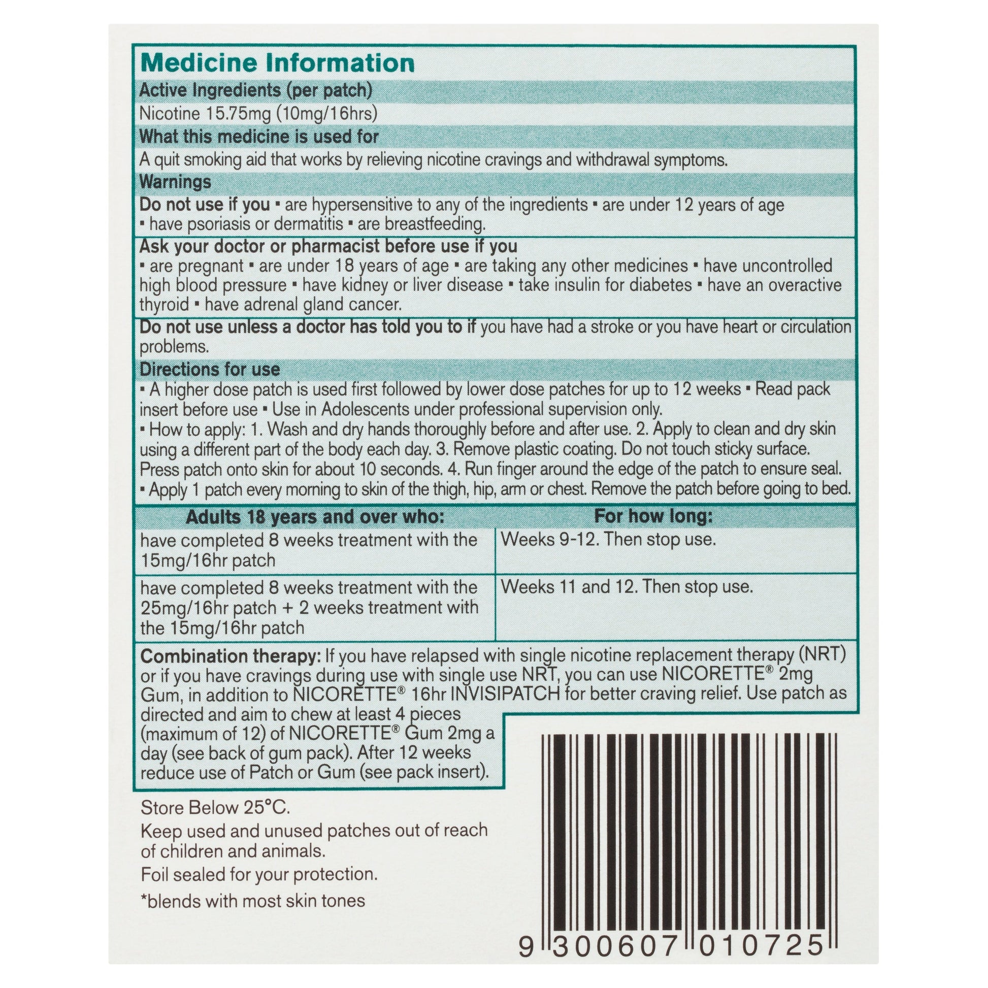 Nicorette InvisiPatch 10mg X 7 is a quit smoking aid. Nicorette 16hr Invisipatch patch works by relieving nicotine cravings and withdrawal symptoms.