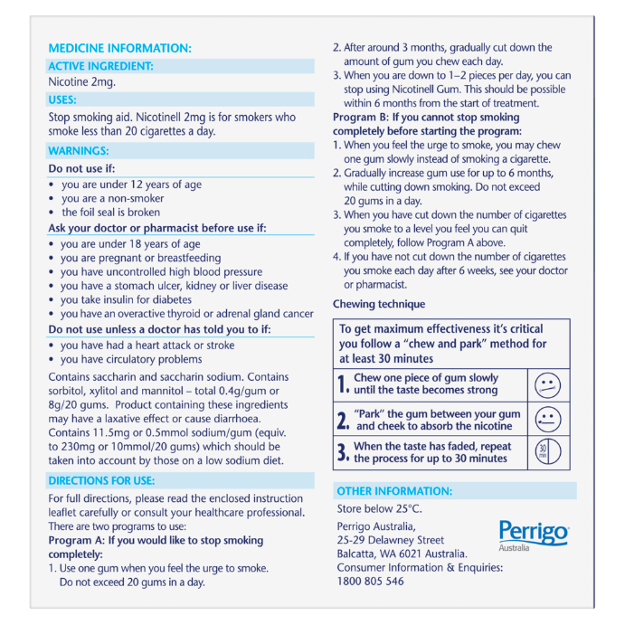 Nicotinell Chewing Gum contains nicotine (2mg/4mg). Helps you stop smoking. Always read the label. Use only as directed. If you have side-effects, see your healthcare professional. Keep out of reach of children. Please read product packaging for further details or ask your pharmacist. Do not use Nicotinell Chewing Gum if your mouth or throat is sore; if you are under 12 years of age; if you are a non-smoker or occasional smoker; if you are allergic or hypersensitive to nicotine or any of the ingredients in the gums.