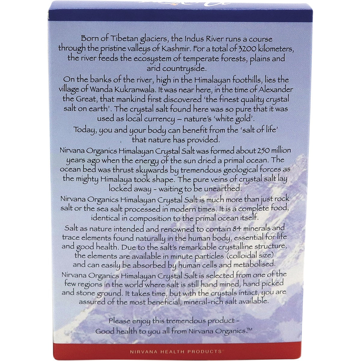 At Nirvana Organics, we have sourced from the Himalayas a totally natural, unrefined, wholesome and holistic crystal salt that is not only great tasting, but is also renowned to contain 84 elements that are essential to life and good health.