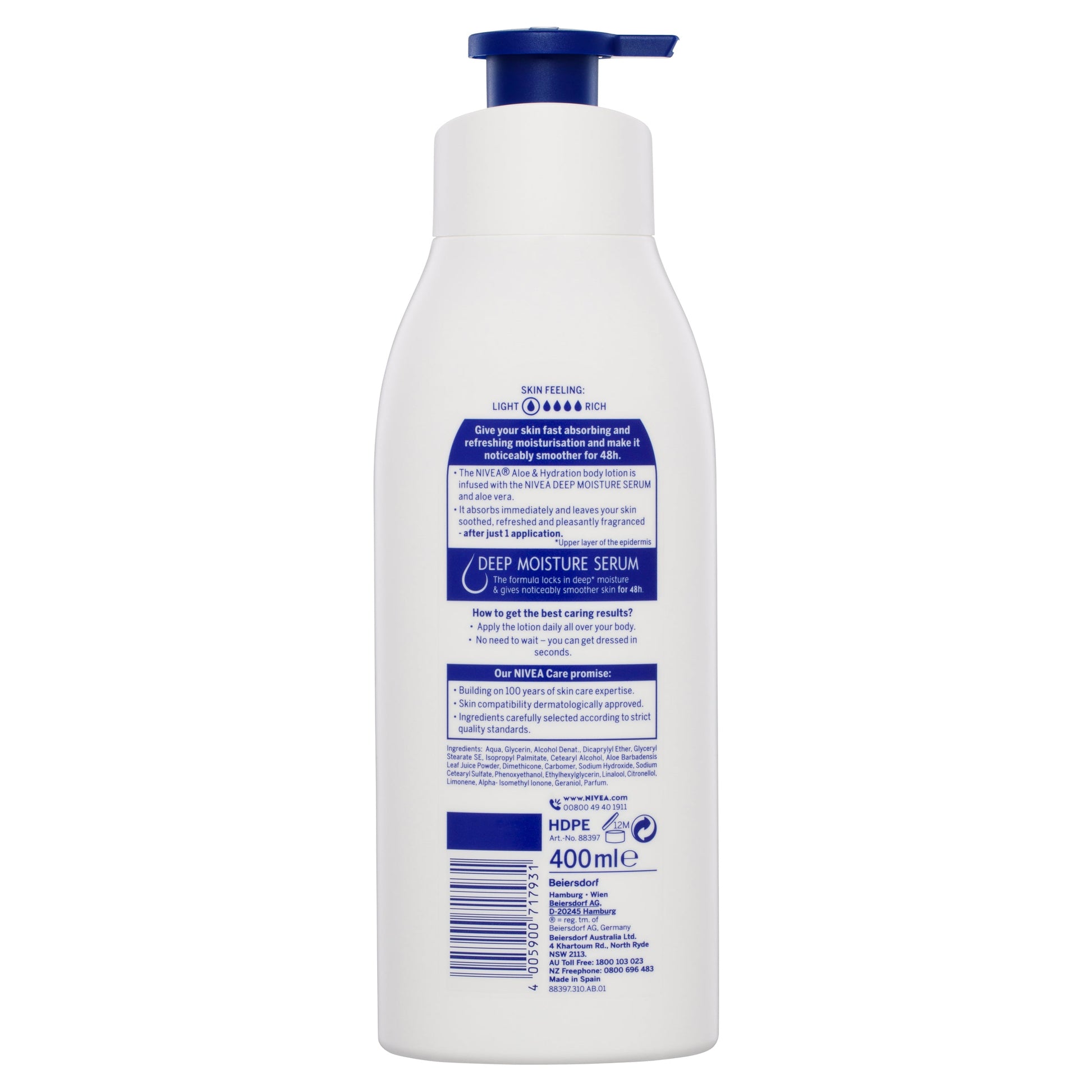 The patented NIVEA formula is using the knowledge, that our skin contains sufficient moisture in its deeper layers. The unique composition of skin’s own moisturiser, moisture-locking lipids and care providing oils bind and hold water in the skin thus the moisture cannot evaporate easily into the surrounding area. The skin is well protected from drying out, because water loss is reduced and the moisture level of the skin is increased. The latest testing methods have shown that the perfect combination of high quality ingredients of our NIVEA body lotions together with the NIVEA DEEP MOISTURE SERUM penetrates deeply into the skin, locking moisture and providing deep moisture for 48h. An effect you can not only feel but also see.Suitable For: Normal to Dry Skin.