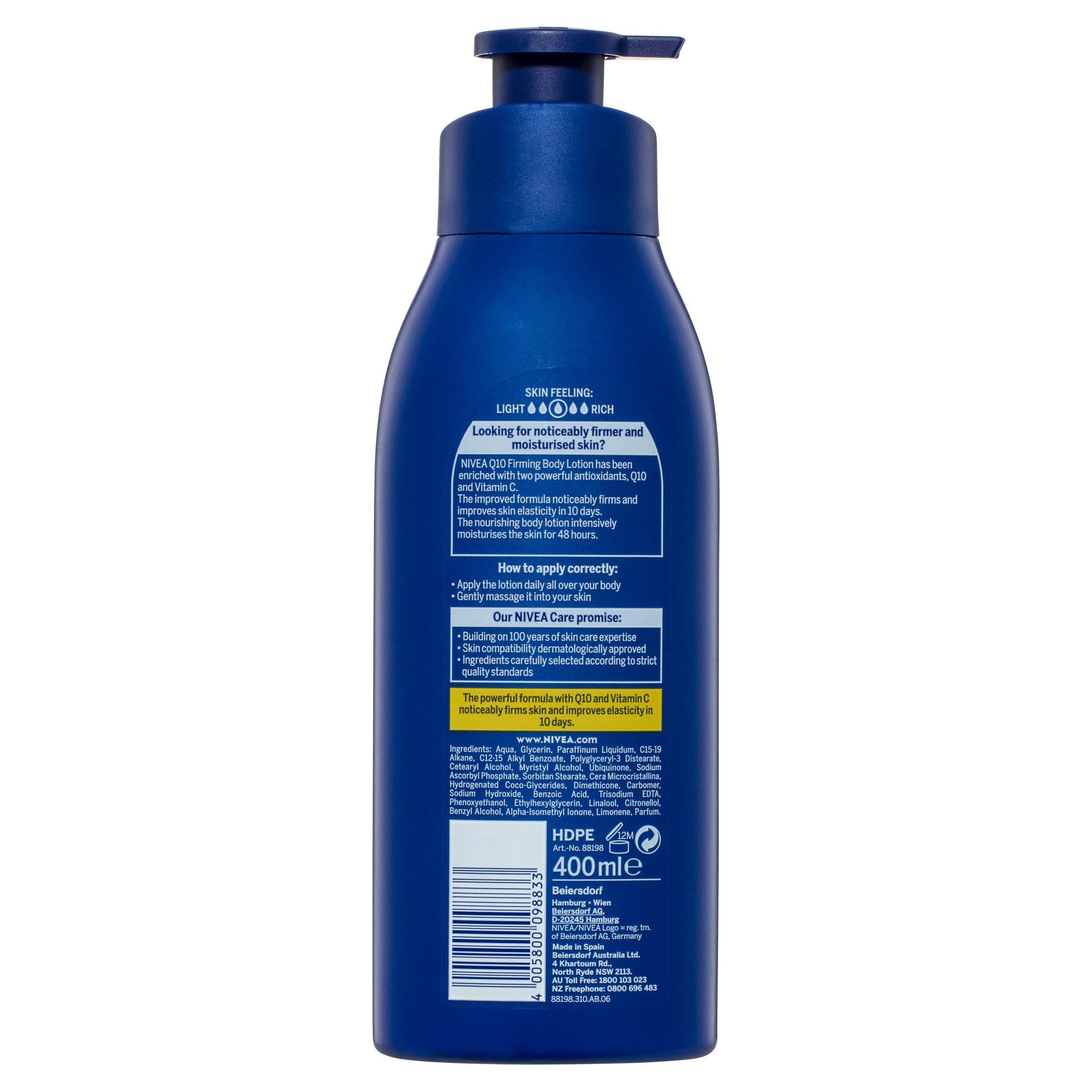 NIVEA Q10 Firming Body Lotion with Vitamin C Noticeably firms and improves skin elasticity in 10 days.