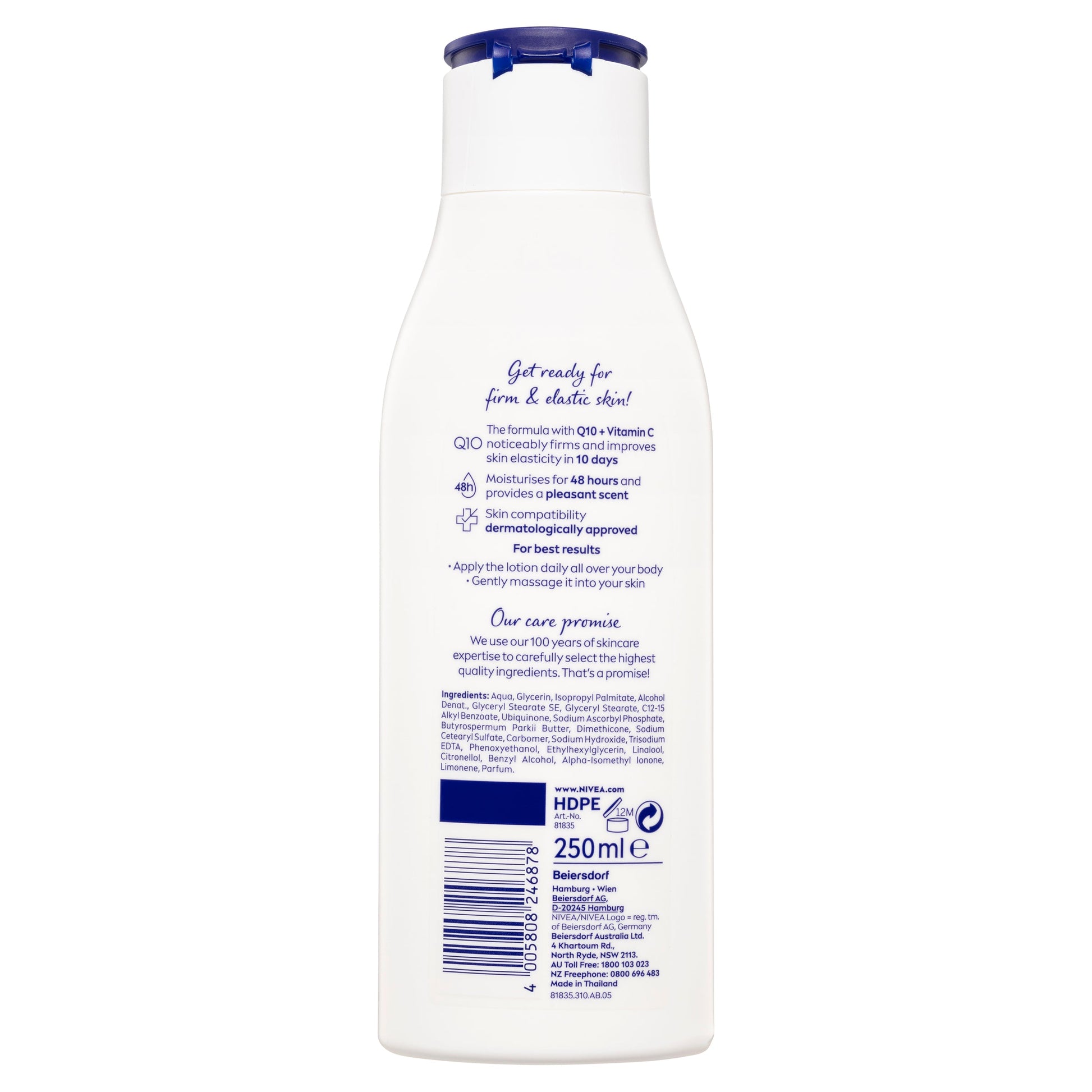 NIVEA Q10 Firming Body Lotion has beenenriched with two powerful antioxidants, Q10 and Vitamin C. The improved formula noticeably firms and improves skin elasticity in 10 days.