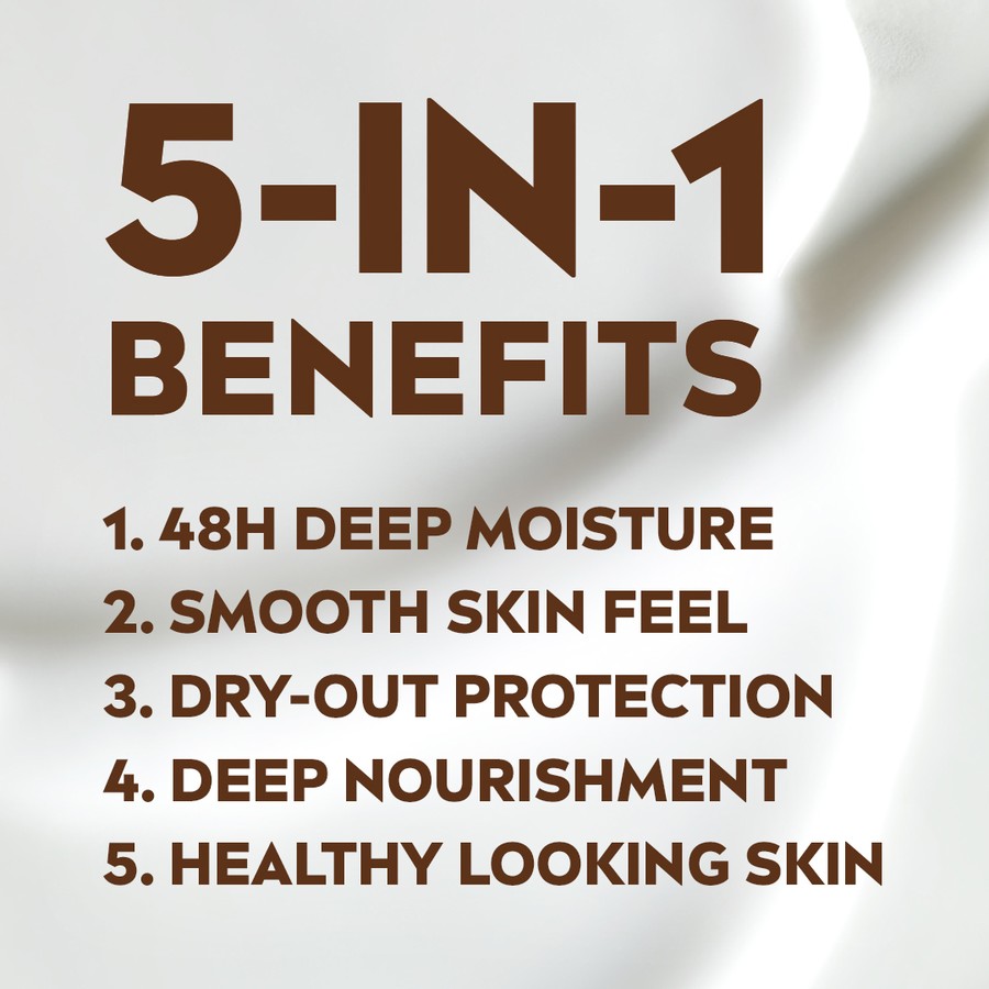 • 48h nourishing deep moisture care.• DEEP MOISTURE SERUM and cocoa butter & vitamin E.