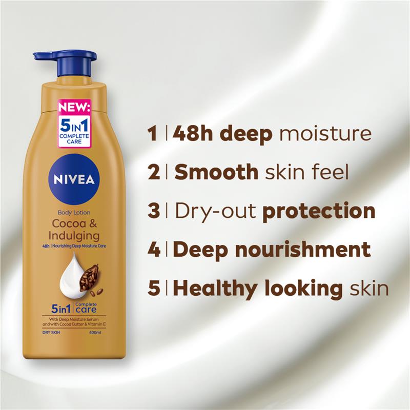 48h nourishing deep moisture care and noticeably smoother skin: NIVEA Cocoa & Indulging body lotion.