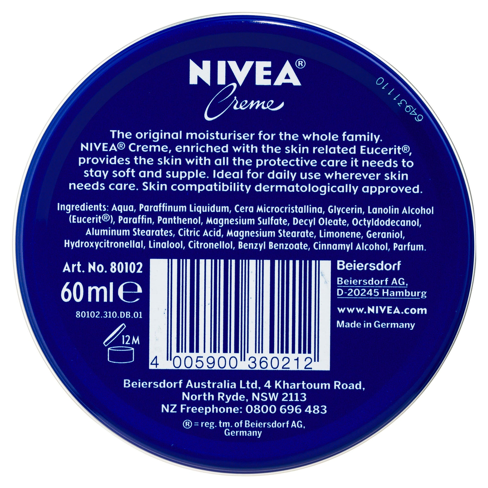 NIVEA Creme is the original moisturiser for the whole family. This iconic product is enriched with the skin related Eucerit®, which provides the skin with all the protective care it needs to stay soft and supple. Ideal for daily use wherever skin needs care. Skin compatibility dermatologically approved: NIVEA Creme.Size: 60mL.