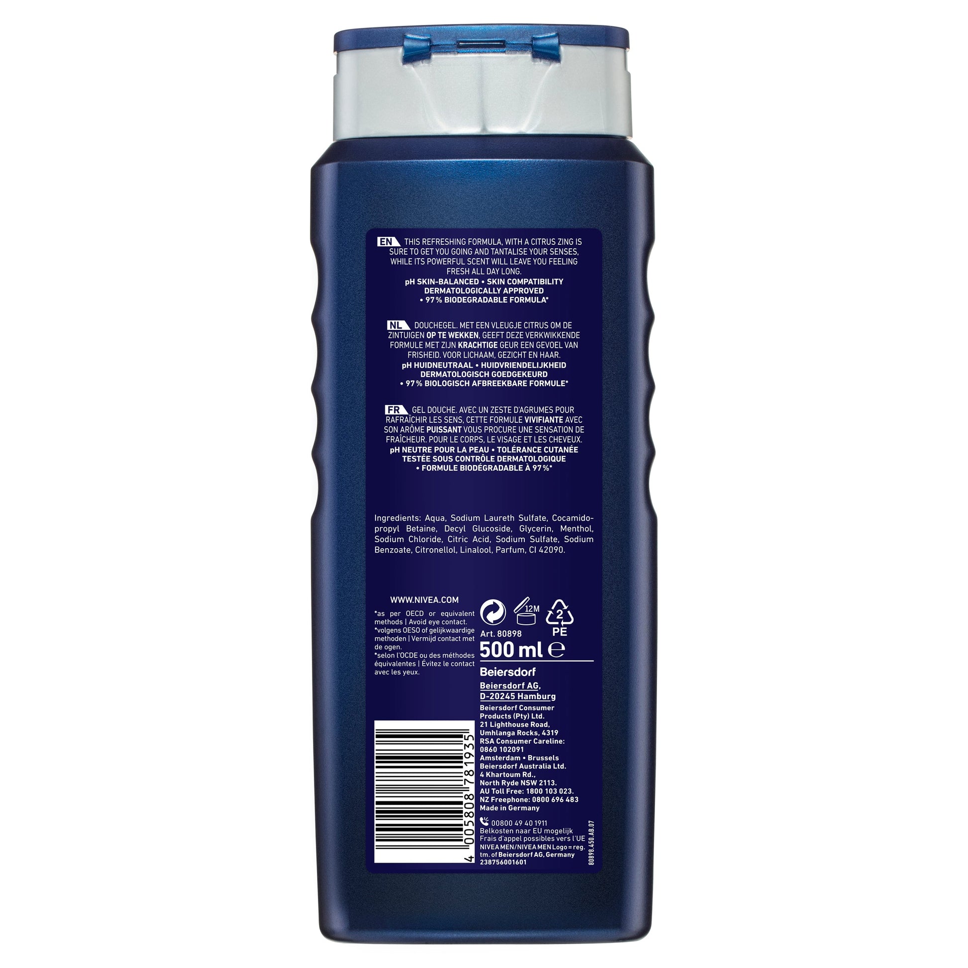 Aqua, Sodium Laureth Sulfate, Cocamidopropyl Betaine, PEG-7 Glyceryl Cocoate, Glycerin, Menthol, Sodium Chloride, Alcohol Denat., PEG-40 Hydrogenated Castor Oil, Polyquaternium-7, Citric Acid, PEG-200 Hydrogenated Glyceryl Palmate, Benzophenone-4, Sodium Benzoate, Limonene, Citronellol, Linalool, Parfum, CI 42090