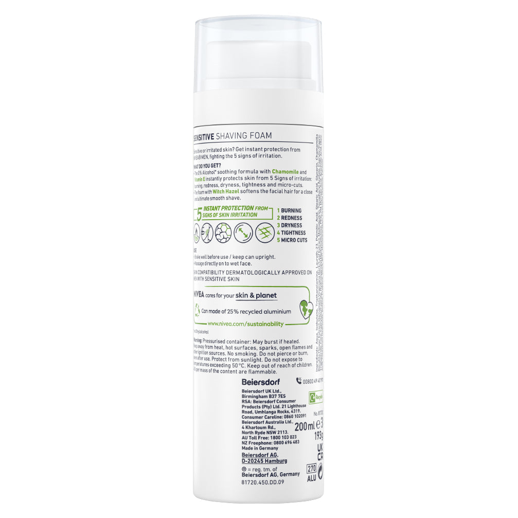 NIVEA MEN Sensitive Shaving Foam instantly protects skin from 5 signs of shaving irritation: burning, redness, dryness, tightness and micro cuts. The foam with Chamomile and Vitamin E softens beard hair for a close and ultimate smooth shave. Alcohol-free formula is dermatologically approved on men with sensitive skin. Result: skin feels comfortable and smooth and looks healthy and cared for.Size: 200mL.