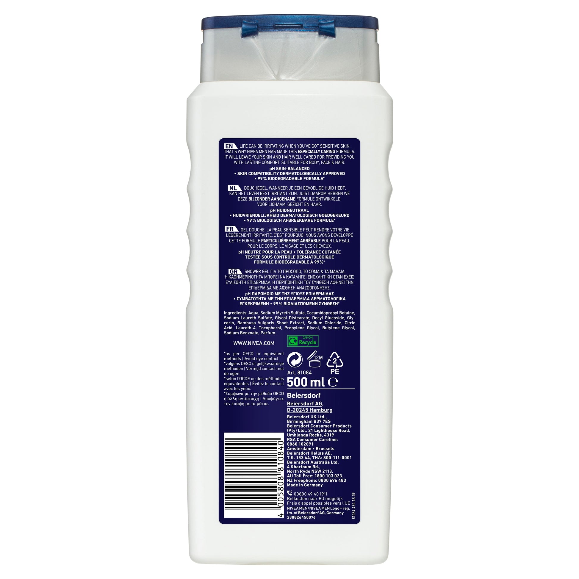 Skin feeling irritated? Protect your skin. NIVEA Men 3-in-1 Sensitive Shower Gel for Body, Face & Hair cleans and protects sensitive skin, leaving it feeling revitalised and cared for.Our caring formula with bamboo milk provides skin with long-lasting freshness. With 0% ethylalcohol, it is PH skin-balanced and dermatologically approved for skin tolerance.