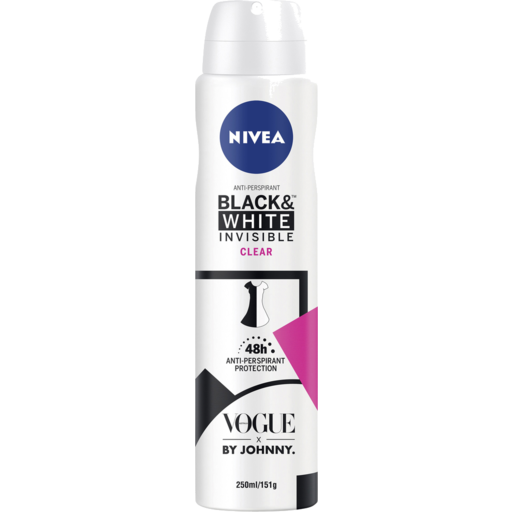 Keep your black clothes black and white clothes white with NIVEA Invisible for Black & White Clear Deodorant. The first 48-hour antiperspirant deodorant that provides anti-yellow sweat stain protection and guards against white marks on your black clothes. Our unique formula with a delicate "clear" fragrance protects you and your favourite clothes. Our deodorant uses a technology with a specific anti-staining compound. The active ingredients protect textile fibres before the stain components can reach and penetrate them. Then with the use of aluminium salts that are dissolved in an emulsion and coated with masking oils, the white residue sometimes left by deodorants is invisible on clothing. It contains no ethylalcohol and is dermatologically proven for skin tolerance.Size: 250mL