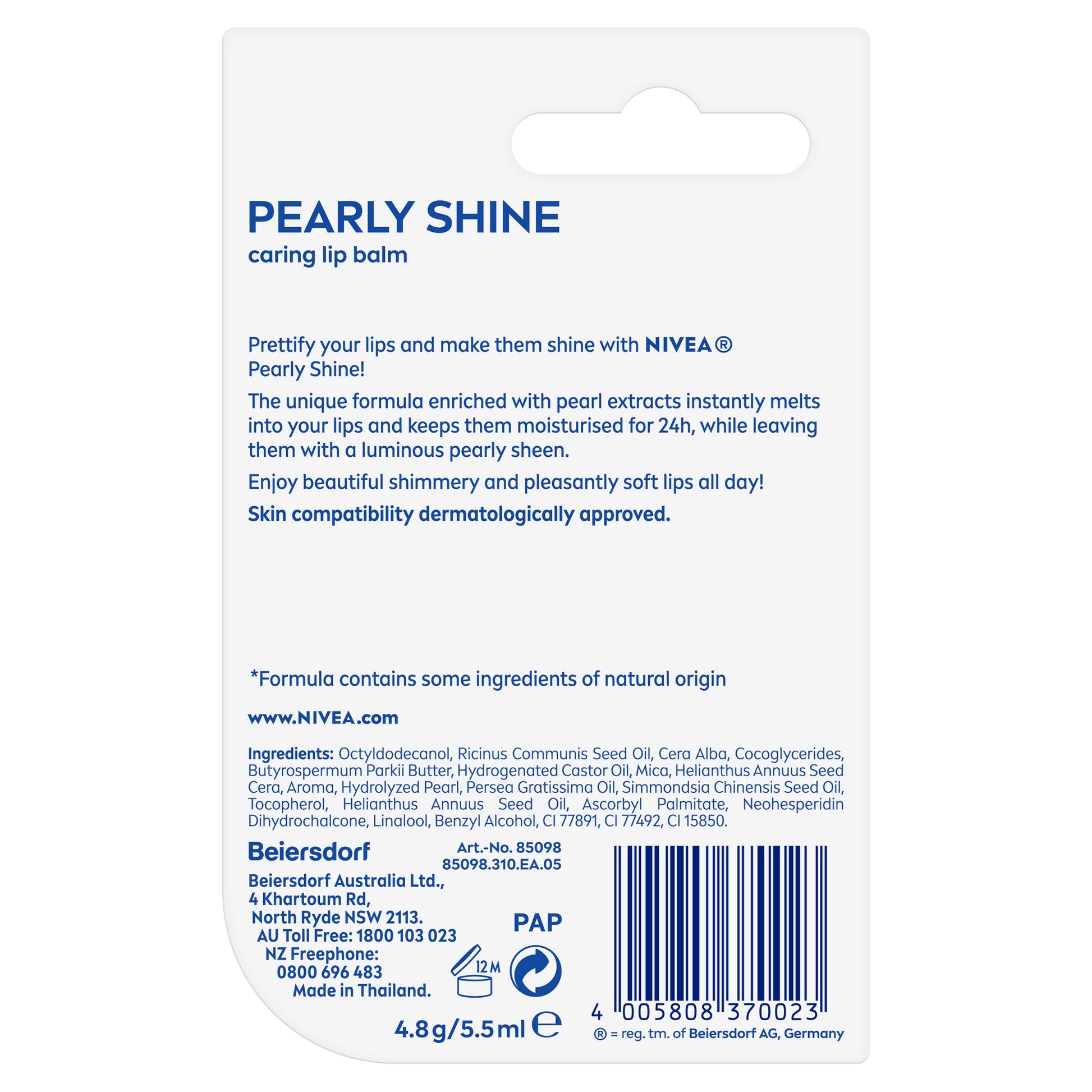 With a kiss of rose and a pearly shimmer, NIVEA Pearly Shine Lip Balm enhances the beauty of your lips. Our new formula, with precious pearl and silk extracts, stores long-lasting moisture, while natural oils soften and condition your lips.- Beautifies with a pearly shimmer.