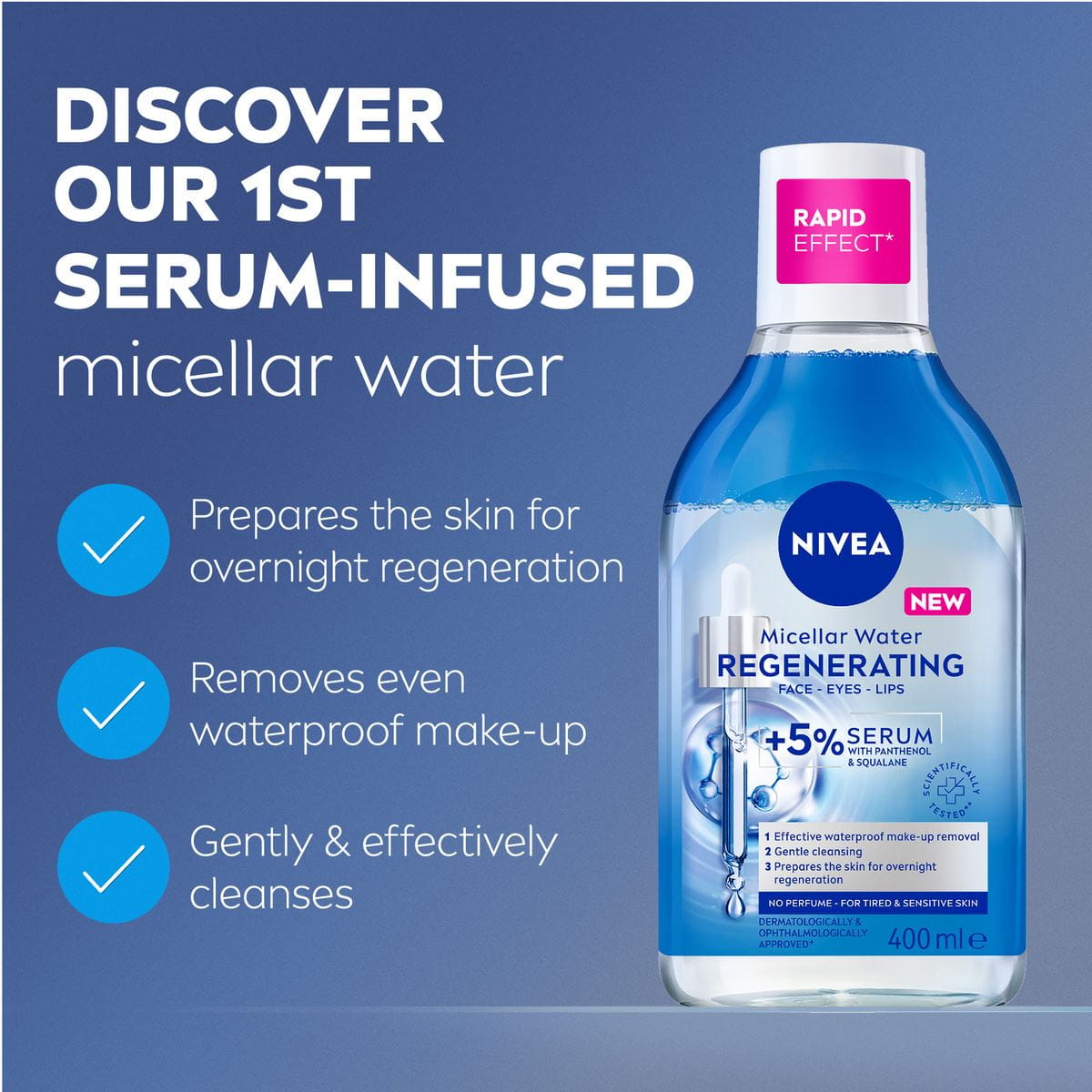 Discover the magical power of NIVEA MicellAIR® SKIN BREATHE micellar water. This 3-in-1 make-up remover removes make-up effectively, cleanses gently & deeply and refreshes & hydrates without leaving cleansing product residue on your skin. The micelles work like a magnet to efficiently attract make-up, dirt and sebum. The gentle yet effective formula can be used on face, eyes and lips. No rinsing. No perfume. No rubbing. Gentle for eyelashes.Your skin is perfectly clean, soft and supple, without any residue left. For healthy looking skin that can breathe.Size: 400mL.