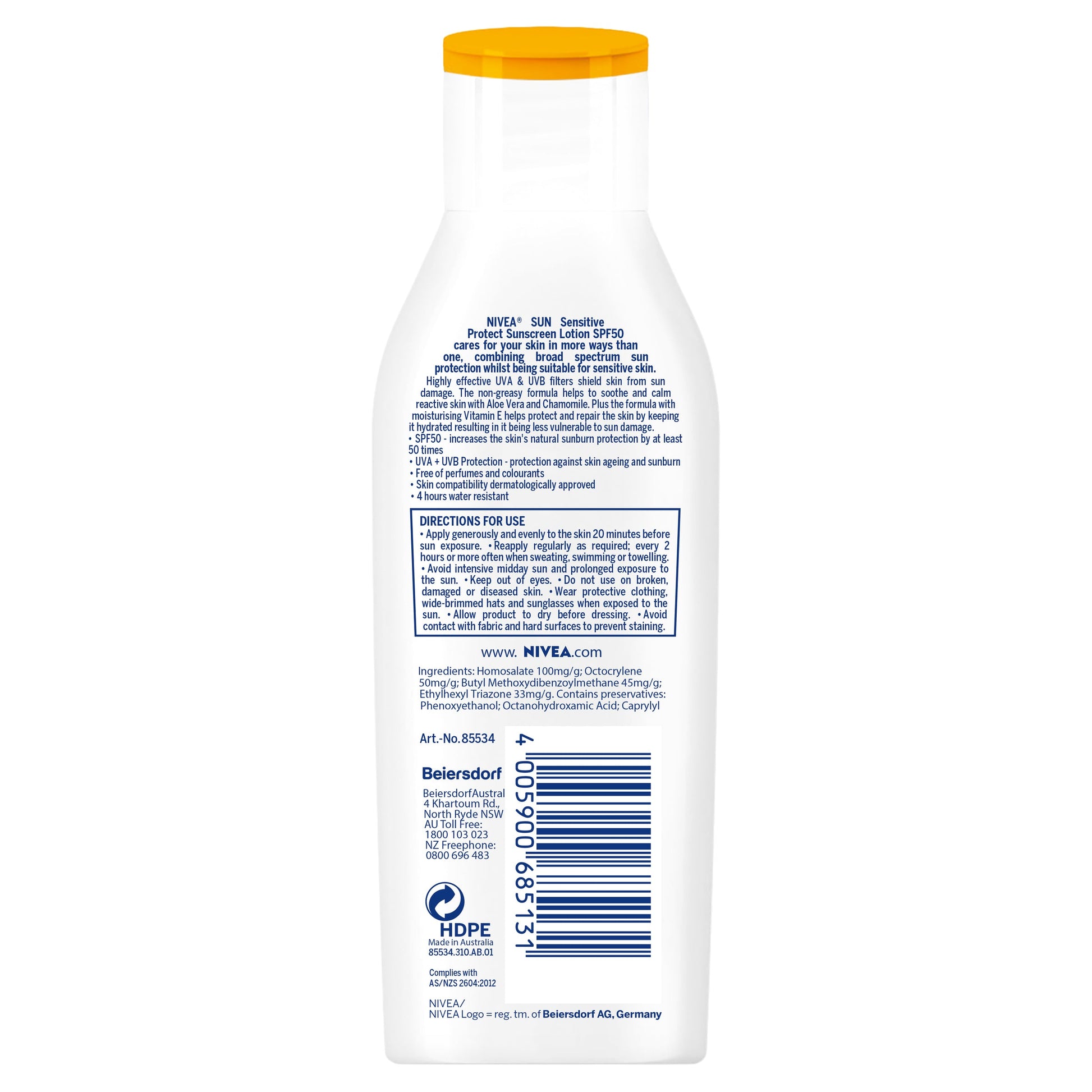NIVEA SUN Sensitive Protect Sunscreen Lotion SPF50 cares for your skin in more ways thanone, combining broad spectrum sun protection whilst being suitable for sensitive skin.