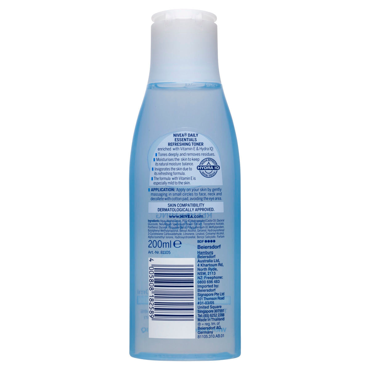 NIVEA Daily Essentials Refreshing Toner enriched with Vitamin E & Hydra IQ tones the skin deeply and removes residues. The refreshing formula invigorates and moisturises the skin to keep its natural moisture balance.Size: 200mL.