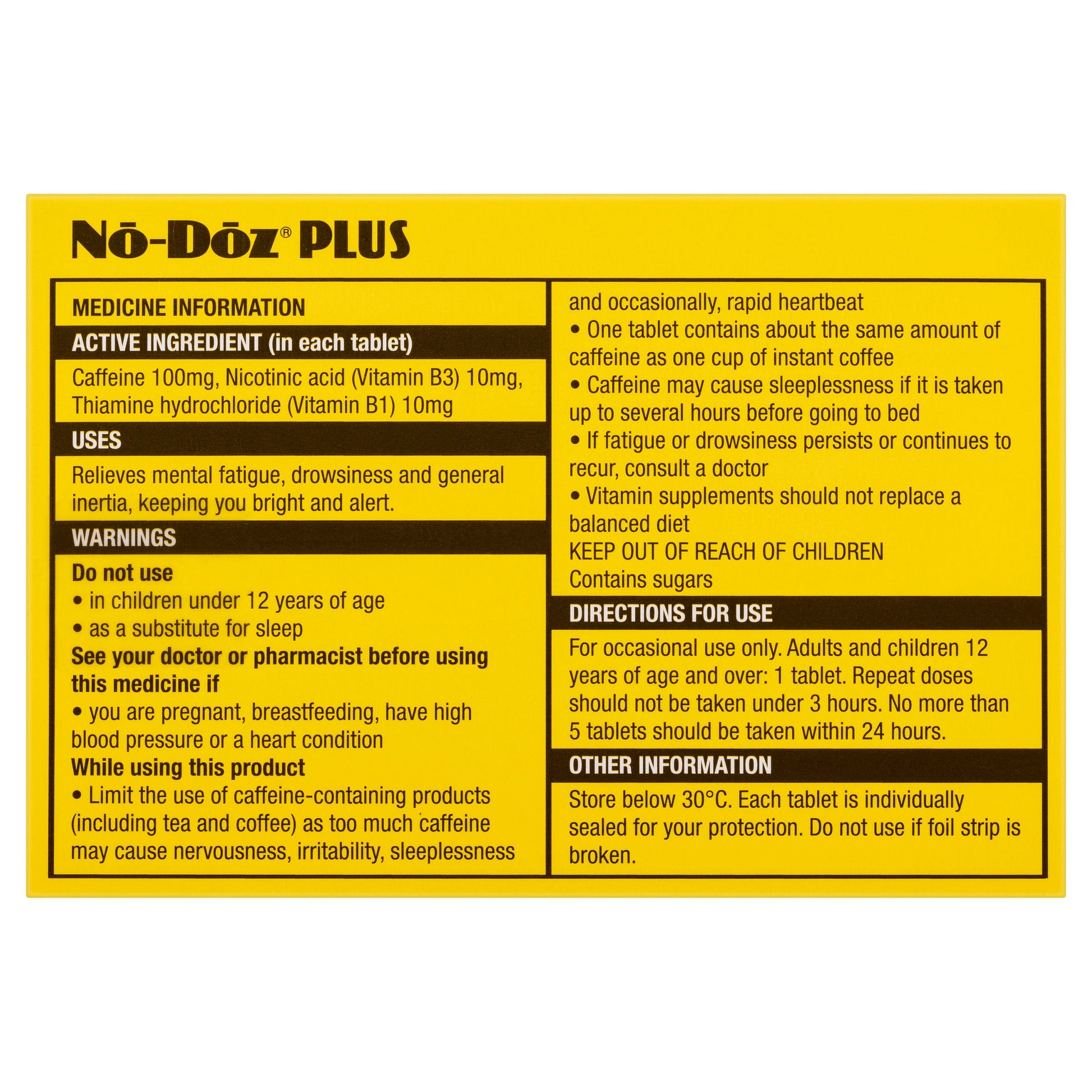 No-Doz Plus is a caffeine tablet that contains 100 mg of caffeine plus Vitamin B1 (10mg thiamine hydrochloride) and Vitamin B3 (nicotinic acid) in a base containing glucose.