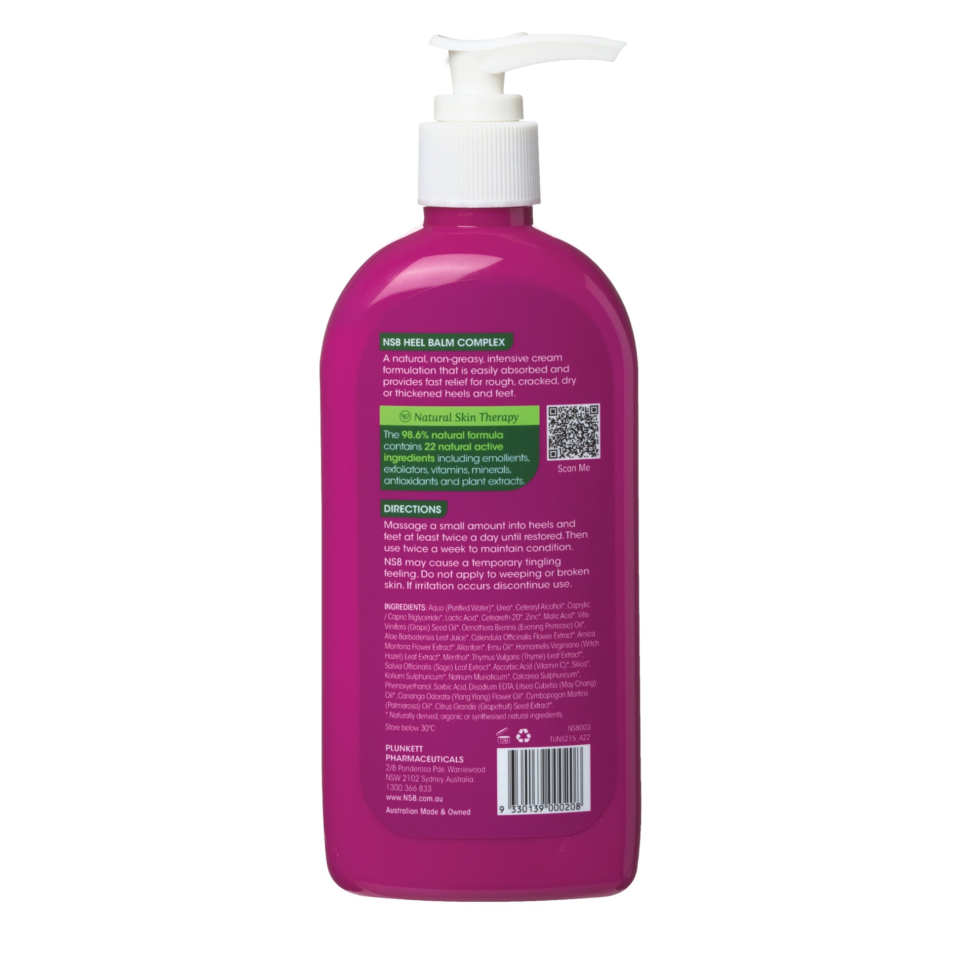 NS-8 Heel Balm Complex contains a broad spectrum of natural extracts, vitamins, moisturisers and exfoliants that work in synergy to remove thickened skin and raise moisture binding to quickly restore soft, smooth and supple skin to problem heels and feet.