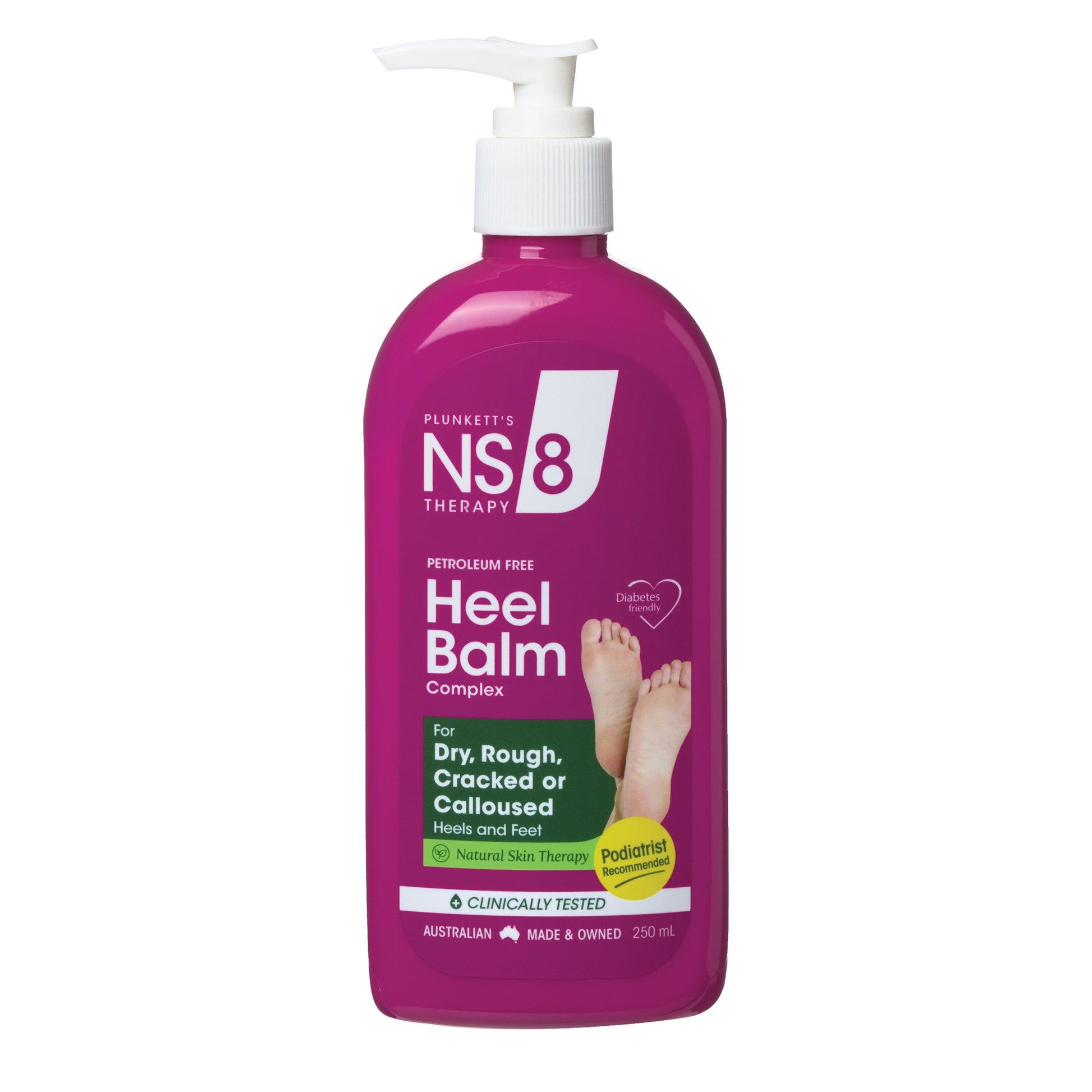 NS-8 Heel Balm Complex is a natural, non-greasy, intensive formulation which is easily absorbed and provides fast relief for rough, cracked, dry or thickened heels and feet.