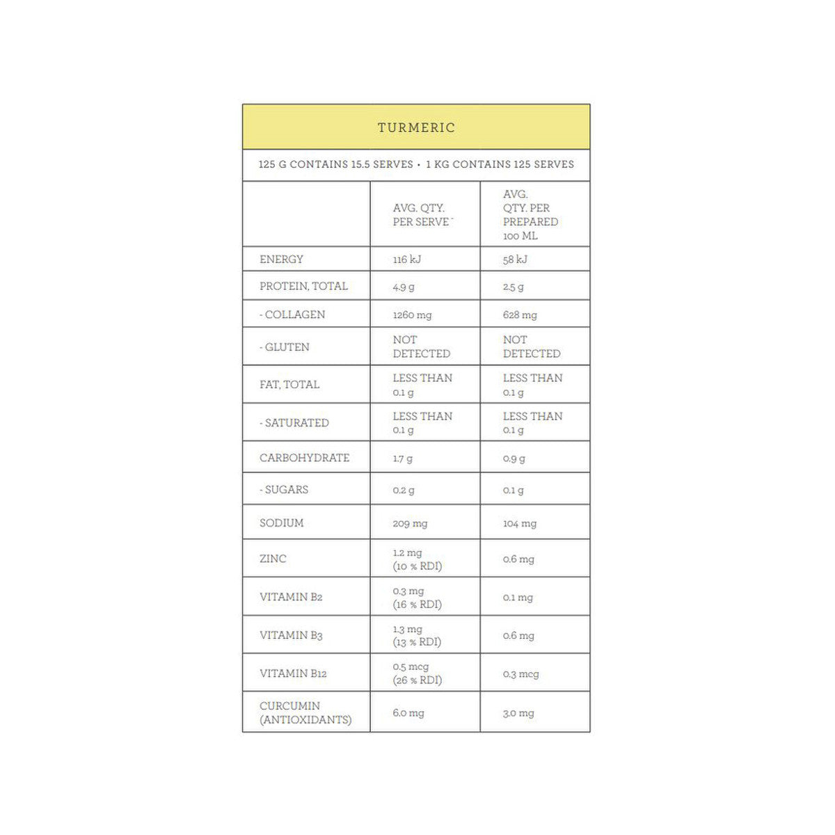 Grass Fed Beef Bone Broth (76%) (Beef Bones, Beef Broth, Collagen, Pacific Sea Salt, Apple Cider Vinegar*), Tapioca Starch*, Deactivated Nutritional Savoury Flakes, Turmeric* (2%), Black Pepper. *Certified Organic Ingredients