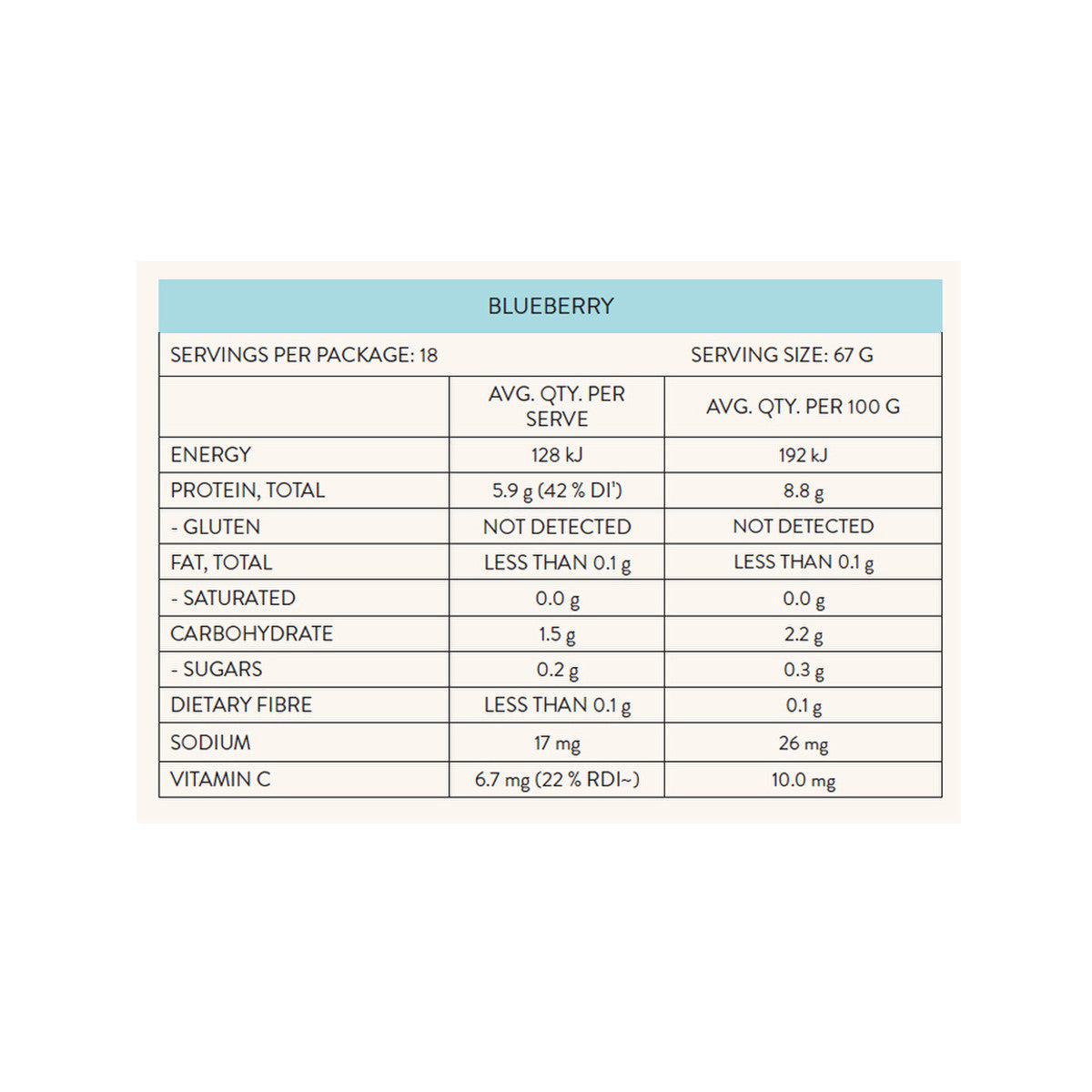 Australian Grass Fed Bovine Gelatin (80 %), Premium Fruits [Blueberry* (7%), Apple*, Wildcrafted Sea Buckthorn*], Natural Plant Based Flavours, Blue Spirulina, Natural Sweetener (Thaumatin).