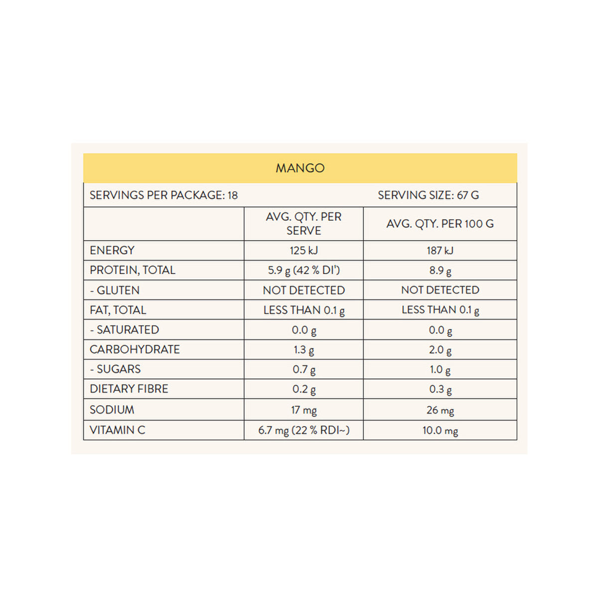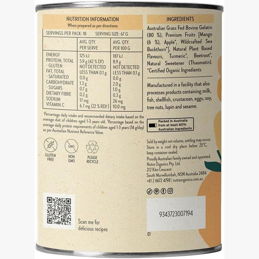Australian Grass Fed Bovine Gelatin (80 %), Premium Fruits [Mango (6 %), Apple*, Wildcrafted Sea Buckthorn*], Natural Plant Based Flavours, Turmeric*, Beetroot*, Natural Sweetener (Thaumatin).