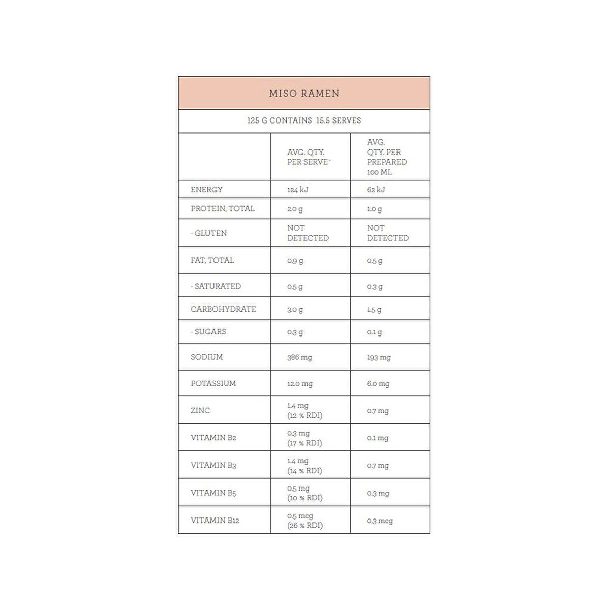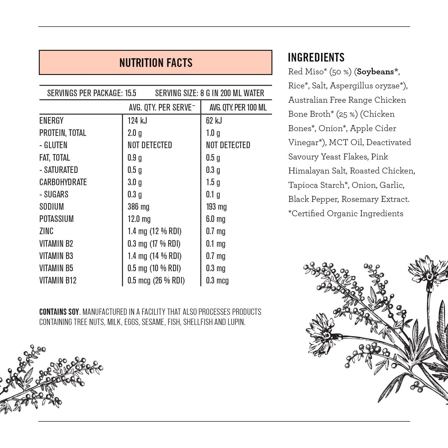 Red Miso* (50%) (Soybeans*, Rice*, Salt, Aspergillus oryzae*), Australian Free Range Chicken Bone Broth* (25%) (Chicken Bones*, Onion*, Apple Cider Vinegar*), MCT Oil*, Deactivated Savoury Yeast Flakes, Pink Himalayan Salt, Roasted Chicken, Tapioca Starch*, Onion, Garlic, Black Pepper, Rosemary Extract. *Certified Organic Ingredients
