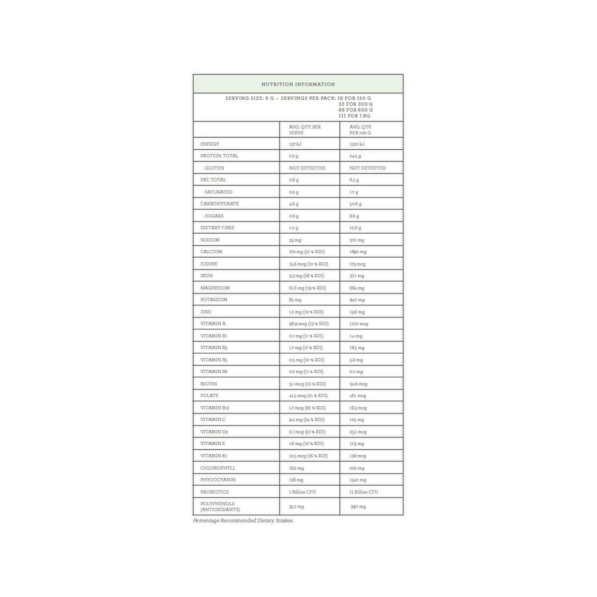 Super Greens (28 %) [Australian Alfalfa*, Spirulina*, Australian Kale*, Chlorella*, Australian Broccoli*, Australian Spinach*, Tasmanian Kelp*], Super Reds (18 %) [Blueberry, Açai*, Raspberry, Strawberry*, Pomegranate, Beetroot*, Goji*, Acerola Extract*, Sea Buckthorn, Queen Garnet Plum, Tomato*], Sprouted & Fermented Golden Pea Protein*, Synbiotic Blend [Prebiotics: Inulin*, Apple Pectin, Green Banana Starch*, Probiotic: BC30® (Bacillus coagulans GBI-30, 6086)], Aquamin Marine Minerals (Arctic Sea Algae* & Salt), Flaxseed*, Sunflower Extract, Pineapple, Lemon, Apple*, Maca Blend (Yellow*, Red*, Black*), Natural Plant Based Flavours, Restorative & Cleansing Botanicals (St. Mary’s Thistle*, Horsetail*, Gotu Kola*, Licorice Root*, Marshmallow Root*, Lemon Balm*, Dandelion Leaf*, Ginger Root*, Ashwagandha*, Aloe Vera Leaf*, Panax Ginseng*), Wholefood Vitamin & Mineral Extracts [Broccoli*, Spinach*, Kale*, Pumpkin*, Sweet Potato*, Sunflower Seeds*, Cranberry*, Chlorella*, Adaptogenic Mushrooms (Maitake Mushroom*, Shiitake Mushroom*)], Camu Camu*, Digestive Enzymes (Protease, Amylase, Lipase, Cellulase, Lactase), Mesquite*, Natural Sweetener (Thaumatin).
