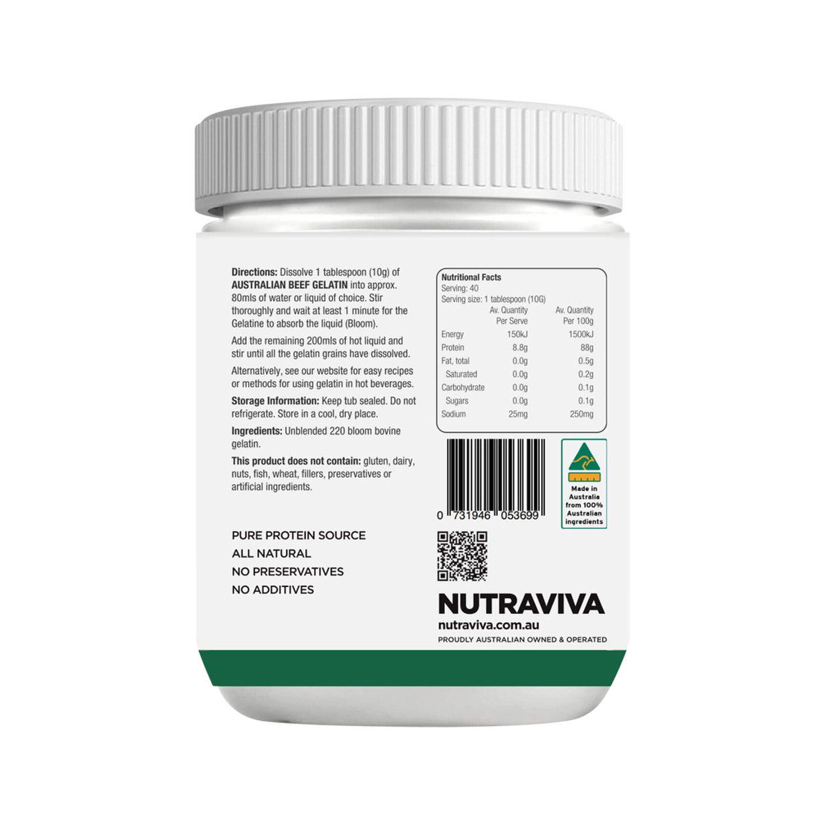 Nutraviva Australian Beef Gelatin is a premium source of Collagen protein providing eight of the nine essential amino acids not synthesised by the human body, but essential for a healthy life. Gelatin cannot be obtained from any plant sources. Beef Gelatin is a good source of dietary protein, providing nutritional benefits as part of a healthy diet involving the consumption of a variety of food.