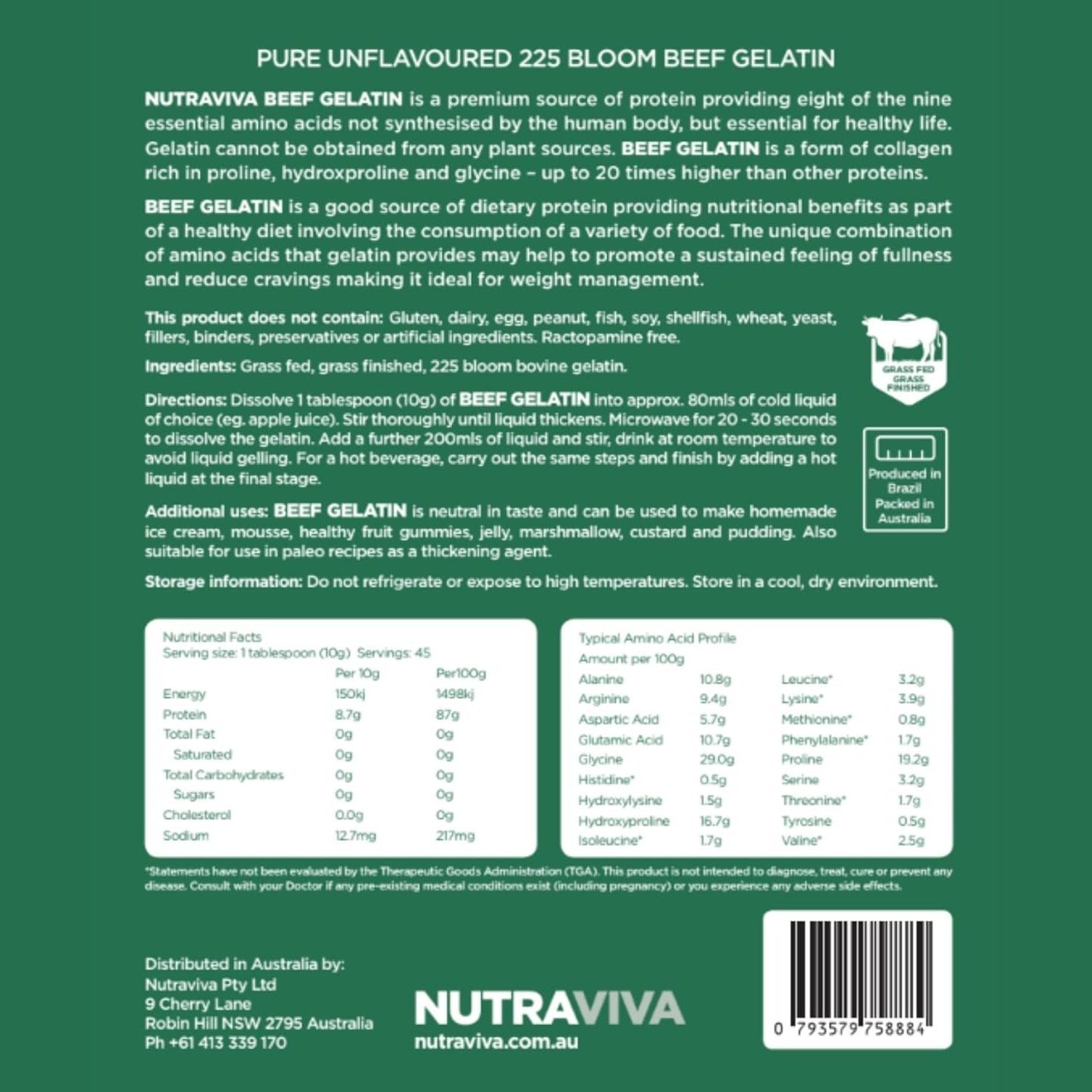 Nutraviva Beef Gelatin is a premium 225 bloom, grass-fed and finished gelatin. It is 100% natural and unblended with inferior grade gelatin.