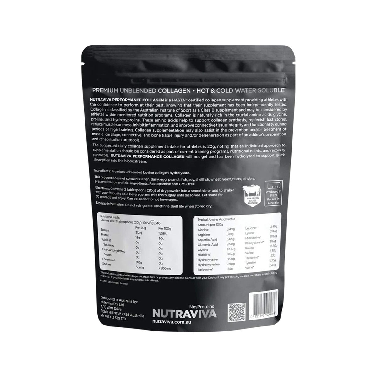 Nutraviva Performance Collagen (Beef) Unflavoured 400g increases muscle strength and improves athletic performance. Made from 100% Australian beef, it contains 18 essential amino acids for optimal muscle recovery and repair. Dissolves easily in hot or cold liquids for convenient intake.