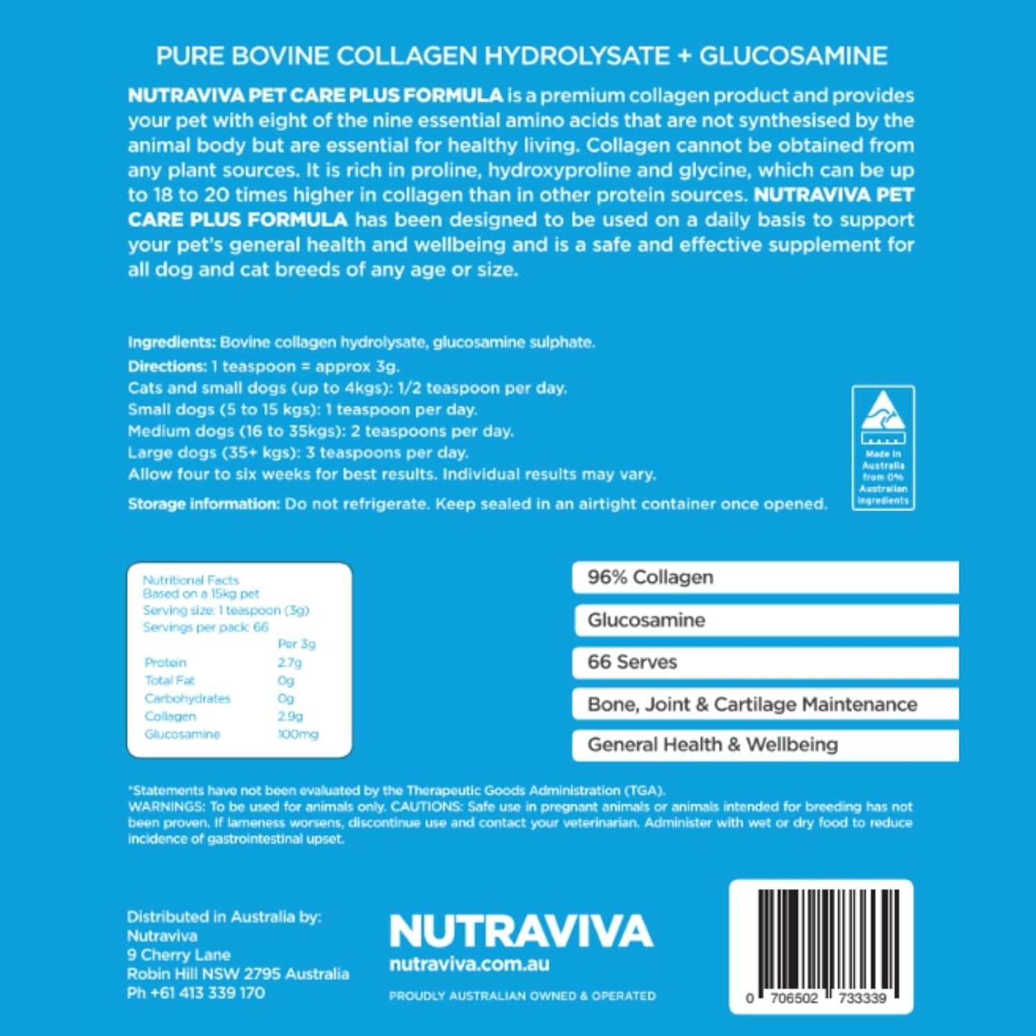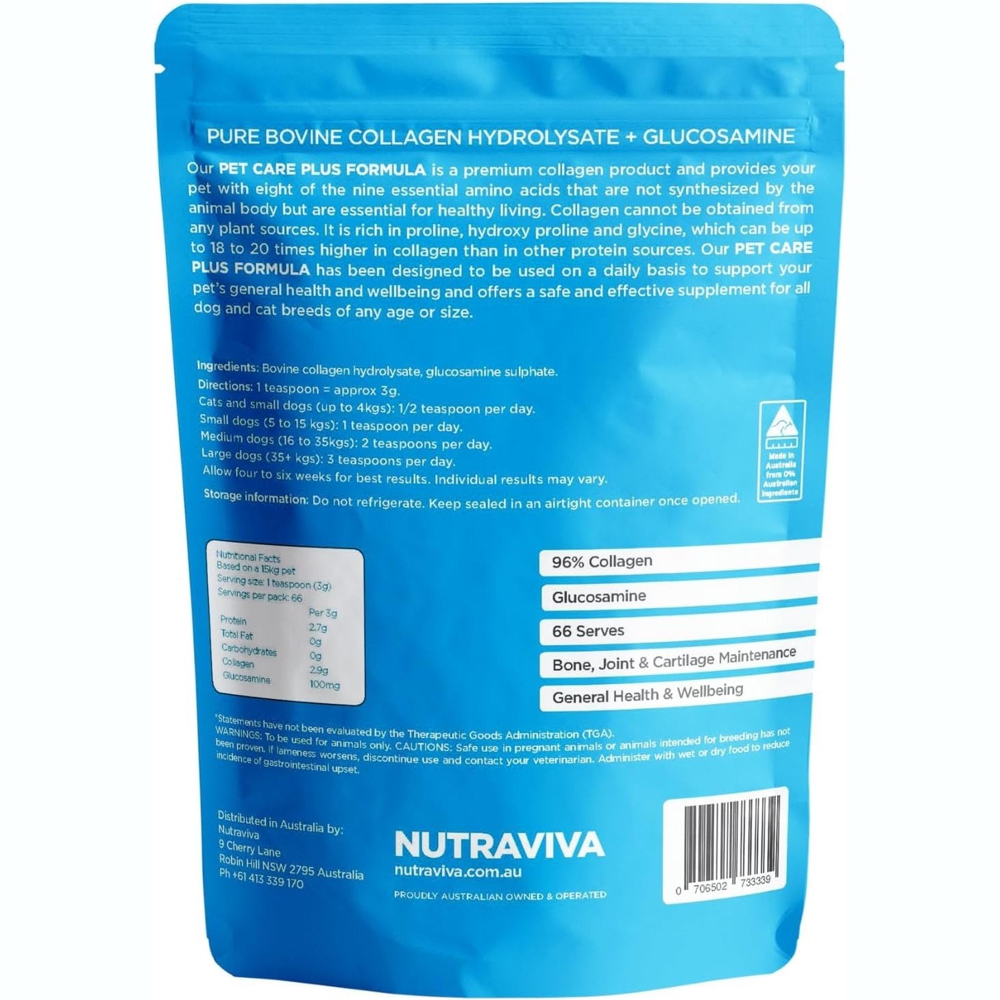 Pet Care Plus Formula is updated packaging of the PetPro Collagen. It contains collagen hydrolysate, which is enzyme-treated to improve bioavailability, and glucosamine HCL which has been specially formulated to assist with your pet's health. The ability to help regenerate collagen inside the animal body is a result of the special glycine, proline and hydroxyproline combination found in collagen hydrolysate.Pet Care Plus Formula has no odour, is tasteless and sticks to dry food. The American Journal Animal & Veterinary Science reported that when 10 grams per day is fed to dogs with osteoarthritis, after 8 weeks there was a marked improvement with dogs showing more mobility, less stiffness and lameness.