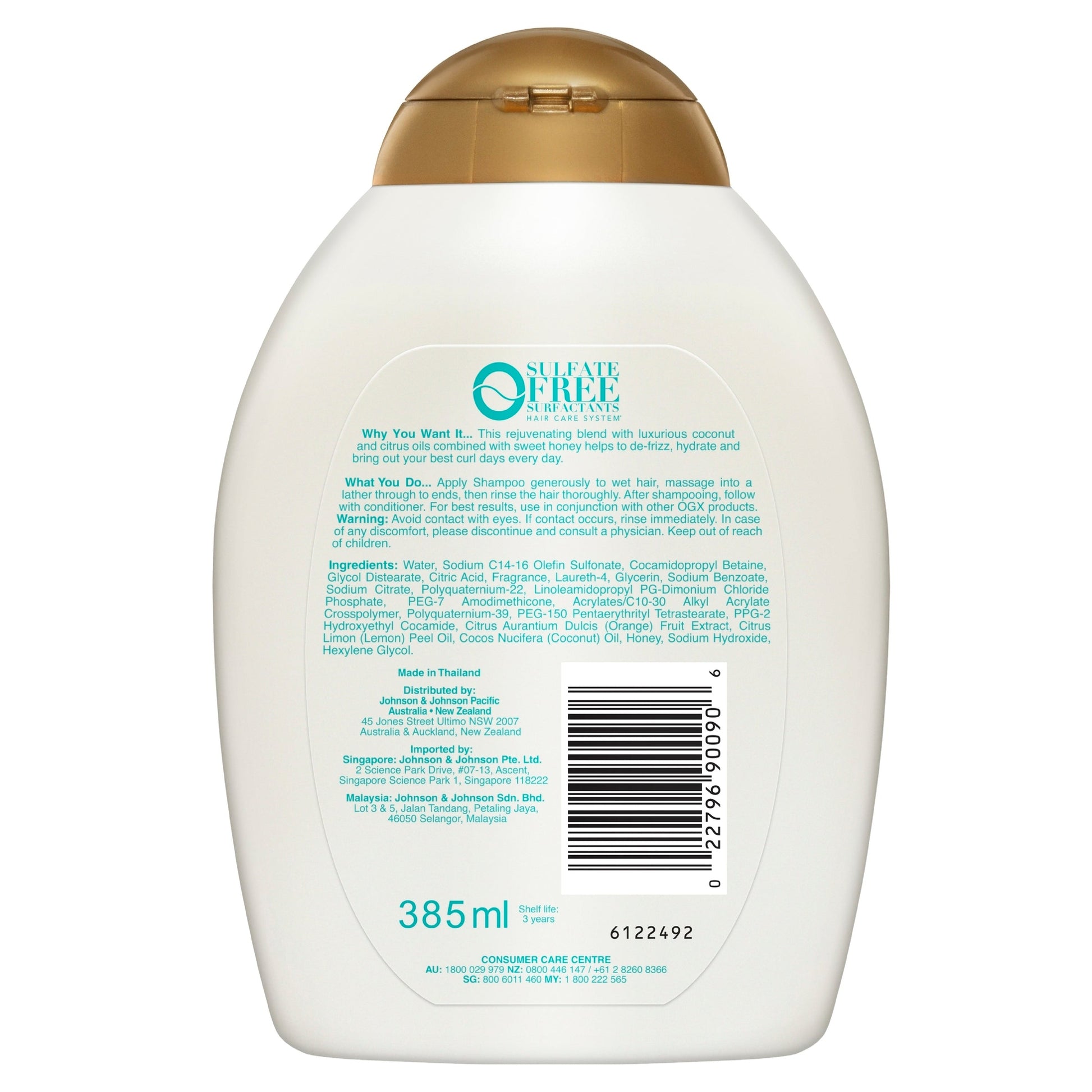 OGX Quenching+ Coconut Curls Shampoo for curly hairWhy You Want It... This rejuvenating sulfate free sufactant shampoo with luxurious coconut and citrus oils combined with sweet honey helps to de-frizz, hydrate and bring out your best curl days everyday.