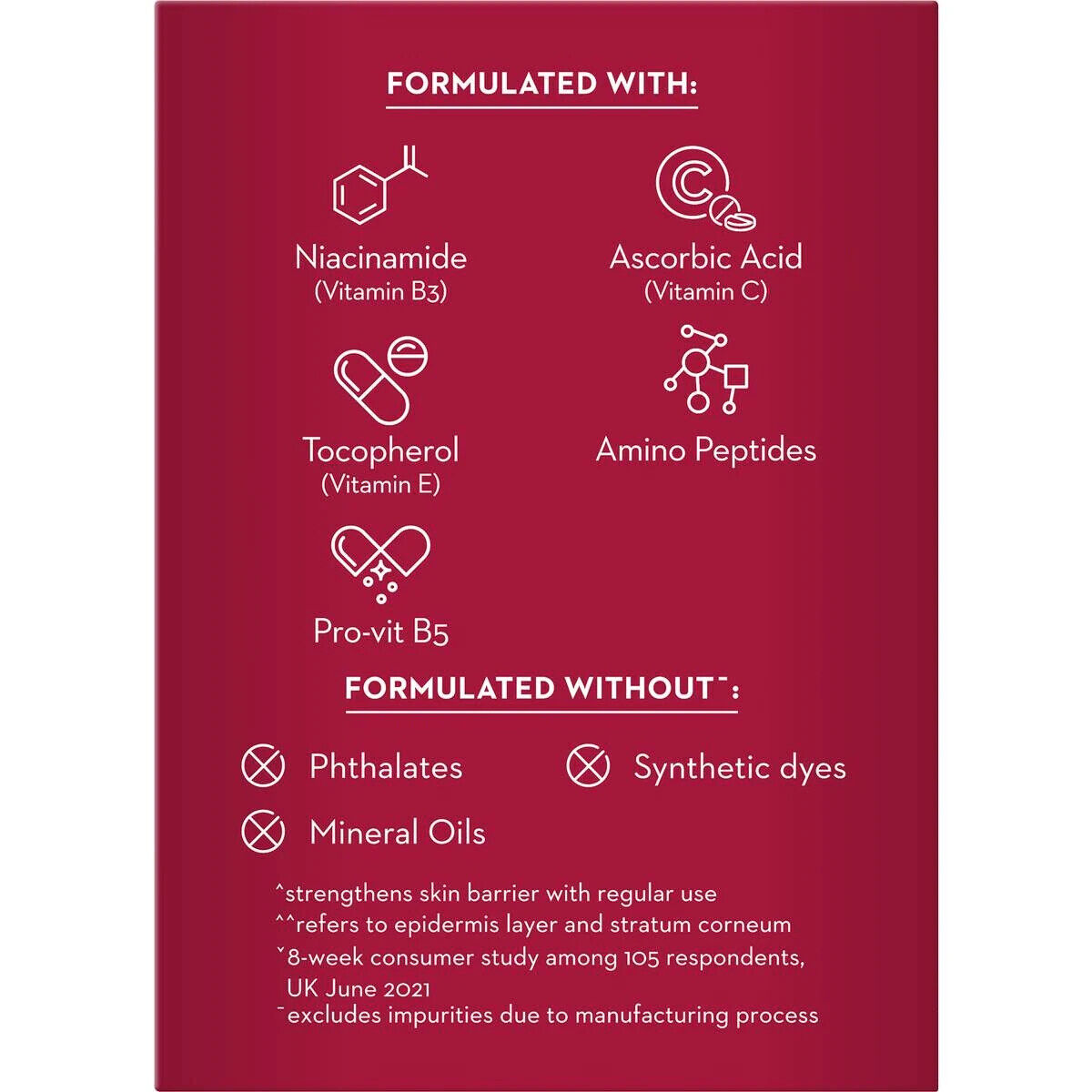 • Boosted with 3 vitamins (B3, C, E) to target skin cells inside