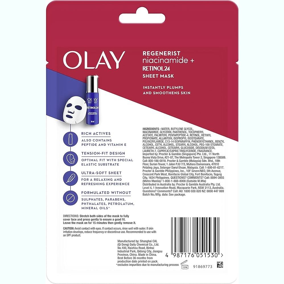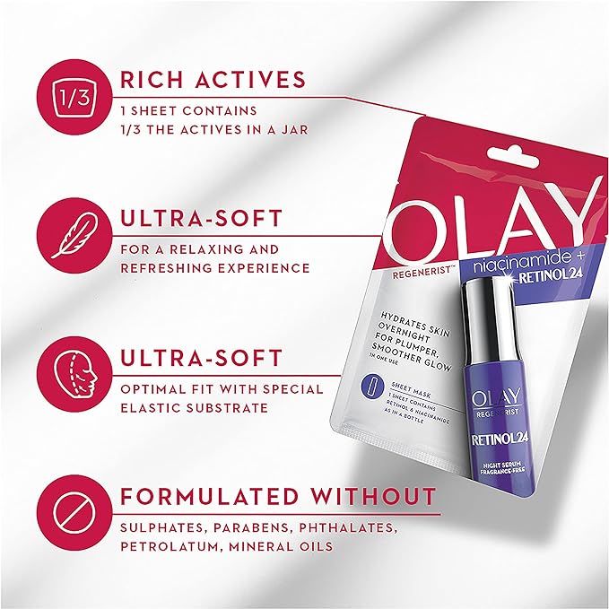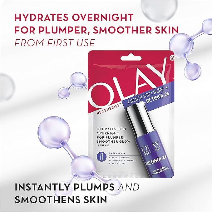 Olay Regenerist Niacinamide + Retinol24 Sheet Mask Hydrates Overnight For Plumper, Smoother Skin From First Use. Instantly Plumps And Smoothens Skin.Olay Regenerist Niacinamide + Retinol 24 Sheet Mask is specifically designed with a special elastic substrate to ensure optimal fit in an ultra-soft sheet for a relaxing and refreshing experience. It contains Retinol and Niacinamide, as in a bottle of Olay Retinol 24 Serum. Niacinamide and Retinyl Proprionate work together to hydrate the skin for a plumper, smoother skin from first use.