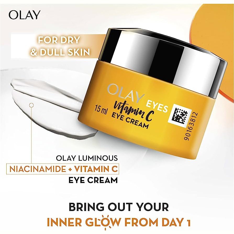 OLAY Luminous Niacinamide + Vitamin C Eye Cream brightens skin around the eyes for a radiant glow. It is lightweight and pleasantly cool, this fast-absorbing formula feels silky and smooth to the touch. This formula, crafted with Vitamin C, Vitamin B3, and Peptides, visibly brightens, hydrates, and improves the appearance of skin. You will instantly experience cooling hydration. 1 month in, the skin around your eyes will feel silky, look refreshed, and have a healthy, well-rested glow.Size: 15mL