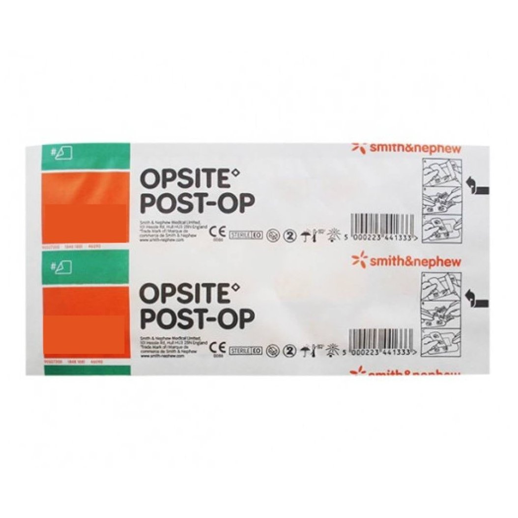 Opsite Post-Op Dressings feature a clear film surrounding an absorbent pad. This waterproof dressing provides a bacteria-proof barrier for low-risk infections, cuts, grazes, and stitches, and helps reduce the risk of secondary infections. The dressing is breathable and can stay in place for up to 7 days.