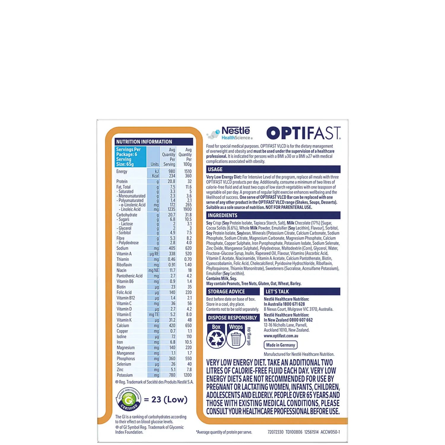 Very Low Energy Diet. Take an additional two litres of calorie-free fluid each day. Unsuitable for use by Pregnant or Lactating Women, Infants, Children, Adolescents or People Older than 65 years of age. People with existing medical conditions, please consult your healthcare professional before use