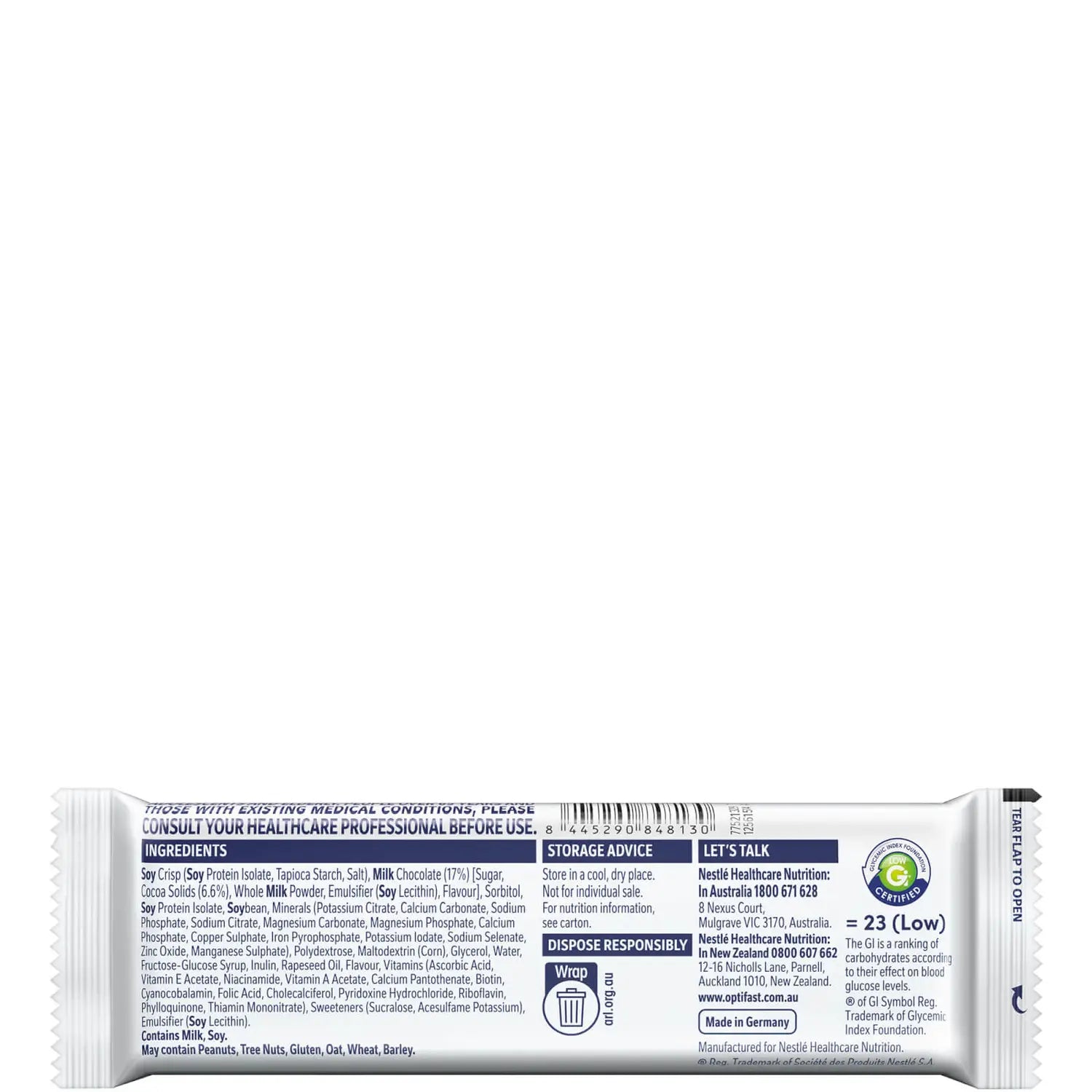 Soy Crisp (Soy Protein Isolate, Tapioca Starch, Salt), Milk Chocolate (17%) [Sugar, Cocoa Solids (6.6%), Whole Milk Powder, Emulsifier (Soy Lecithin), Flavour], Sorbitol, Soy Protein Isolate, Polydextrose, Soy Cores, Minerals (Potassium Citrate, Calcium Carbonate, Sodium Phosphate, Sodium Citrate, Magnesium Hydroxide Carbonate, Magnesium Carbonate, Magnesium Phosphate,