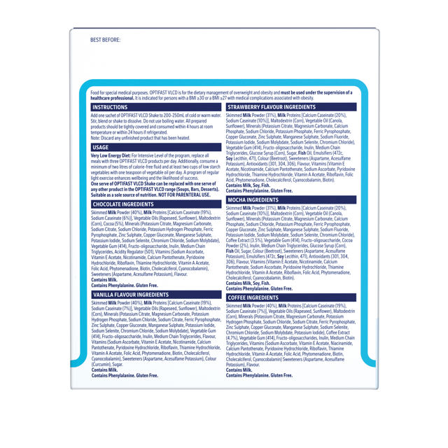 Chocolate: Skimmed Milk Powder (31%), Milk Proteins [Calcium Caseinate (20%), Sodium Caseinate (10%)], Maltodextrin (Corn), Vegetable Oil (Canola, Sunflower), Cocoa Powder (5%), Minerals (Potassium Citrate, Magnesium Carbonate, Calcium Phosphate, Sodium Chloride, Potassium Phosphate, Ferric Pyrophosphate, Copper Gluconate, Zinc Sulphate, Manganese Sulphate, Sodium Fluoride, Potassium Iodide, Sodium Molybdate, Sodium Selenite, Chromium Chloride), Vegetable Gum (414), Fructo-Oligosaccharide, Inulin, Medium Chain Triglycerides, Glucose Syrup (Corn), Sugar, Fish Oil, Emulsifiers (472c, Soy Lecithin, 471), Sweeteners (Aspartame, Acesulfame Potassium), Antioxidants (301, 304, 306), Flavour, Vitamins (Vitamin E Acetate, Nicotinamide, Calcium Pantothenate, Sodium Ascorbate, Pyridoxine Hydrochloride, Thiamine Hydrochloride, Vitamin A Acetate, Riboflavin, Folic Acid, Phytomenadione, Cholecalciferol, Cyanocobalamin, Biotin). Strawberry: Skimmed Milk Powder (31%), Milk Proteins [Calcium Caseinate (20%), Sodium Caseinate (10%)], Maltodextrin (Corn), Vegetable Oil (Canola, Sunflower), Minerals (Potassium Citrate, Magnesium Carbonate, Calcium Phosphate, Sodium Chloride, Potassium Phosphate, Ferric Pyrophosphate, Copper Gluconate, Zinc Sulphate, Manganese Sulphate, Sodium Fluoride, Potassium Iodide, Sodium Molybdate, Sodium Selenite, Chromium Chloride), Vegetable Gum (414), Fructo-Oligosaccharide, Inulin, Medium Chain Triglycerides, Glucose Syrup (Corn), Sugar, Fish Oil, Emulsifiers (472c, Soy Lecithin, 471), Colour (Beetroot), Sweeteners (Aspartame, Acesulfame Potassium), Antioxidants (301, 304, 306), Flavour, Vitamins (Vitamin E Acetate, Nicotinamide, Calcium Pantothenate, Sodium Ascorbate, Pyridoxine Hydrochloride, Thiamine Hydrochloride, Vitamin A Acetate, Riboflavin, Folic Acid, Phytomenadione, Cholecalciferol, Cyanocobalamin, Biotin). Coffee: Skimmed Milk Powder (31%), Milk Proteins [Calcium Caseinate (20%), Sodium Caseinate (10%)], Maltodextrin (Corn), Vegetable Oil (Canola, Sunflower), Minerals (Potassium Citrate, Magnesium Carbonate, Calcium Phosphate, Sodium Chloride, Potassium Phosphate, Ferric Pyrophosphate, Copper Gluconate, Zinc Sulphate, Manganese Sulphate, Sodium Fluoride, Potassium Iodide, Sodium Molybdate, Sodium Selenite, Chromium Chloride), Coffee Extract (4.5%), Vegetable Gum (414), Fructo-Oligosaccharide, Inulin, Medium Chain Triglycerides, Glucose Syrup (Corn), Sugar, Flavour, Fish Oil, Emulsifiers (472c, Soy Lecithin, 471), Sweeteners (Aspartame, Acesulfame Potassium), Antioxidants (301, 304, 306), Vitamins (Vitamin E Acetate, Nicotinamide, Calcium Pantothenate, Sodium Ascorbate, Pyridoxine Hydrochloride, Thiamine Hydrochloride, Vitamin A Acetate, Riboflavin, Folic Acid, Phytomenadione, Cholecalciferol, Cyanocobalamin, Biotin). Vanilla: Skimmed Milk Powder (31%), Milk Proteins [Calcium Caseinate (20%), Sodium Caseinate (10%)], Maltodextrin (Corn), Vegetable Oil (Canola, Sunflower), Minerals (Potassium Citrate, Magnesium Carbonate,