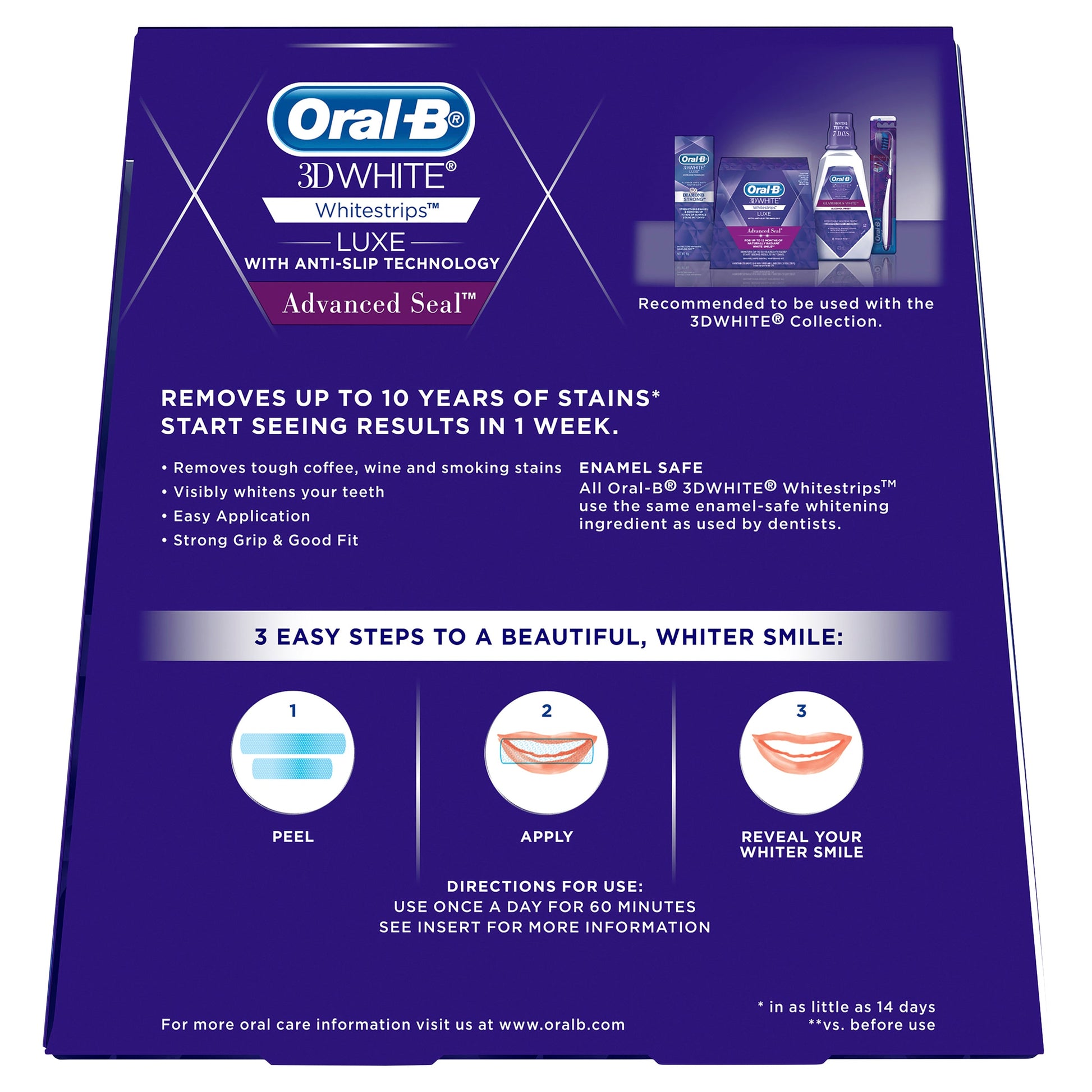Oral-B 3D White Luxe Advance Seal Whitestrips with anti-slip technology, removes up to 10 years of stains in 2 weeks for up to 12 months of a naturally radiant white smile. Revitalises gums and restores weakened enamel.