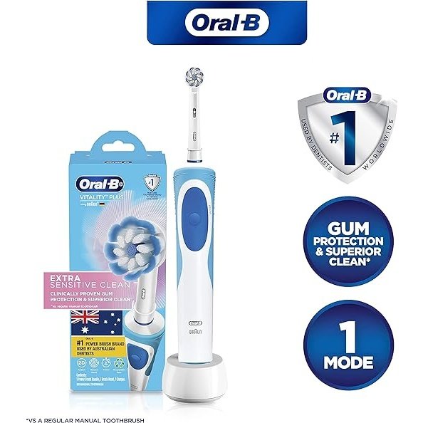 Oral-B Vitality Sensitive Clean Rechargeable Electric Toothbrush with extra soft bristles removes more plaque than an ordinary manual toothbrush. Clinically proven it removes 100% more plaque. It's round head cleans better for healthier gums.