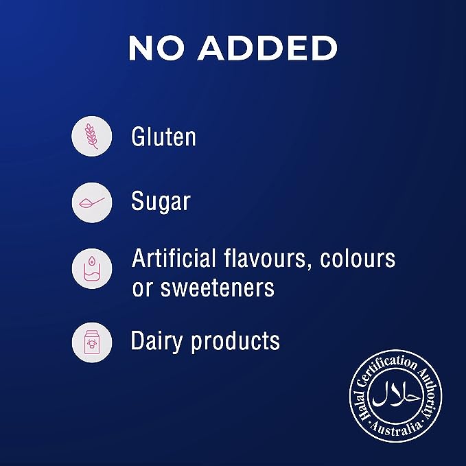 No added yeast, gluten, lactose, sugar, artificial colours, flavours or sweeteners, preservatives, or dairy products. This product is halal certified.