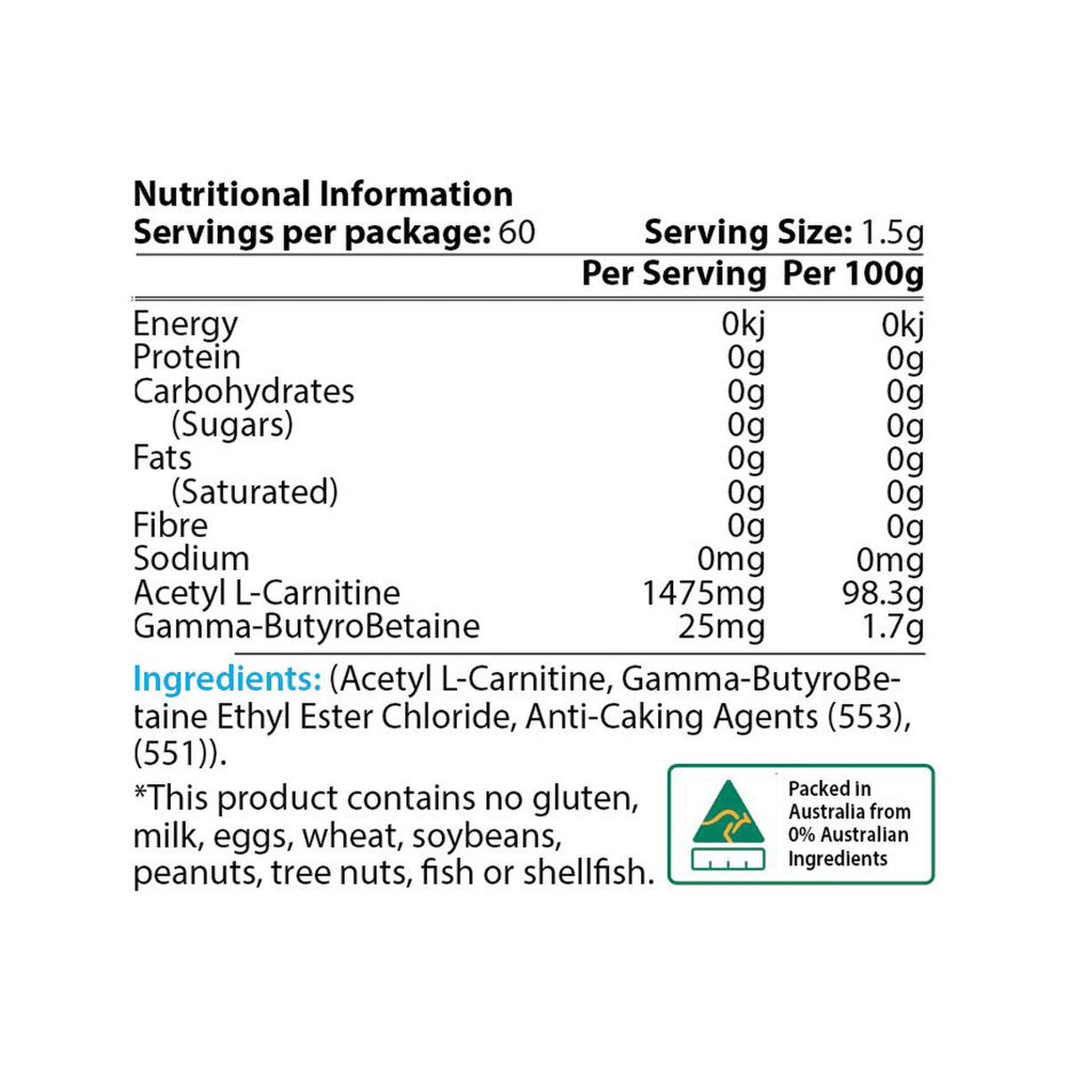 Acetyl L-Carnitine, Gamma-ButyroBetaine Ethyl Ester Chloride, Anti-caking agents (553), (551).