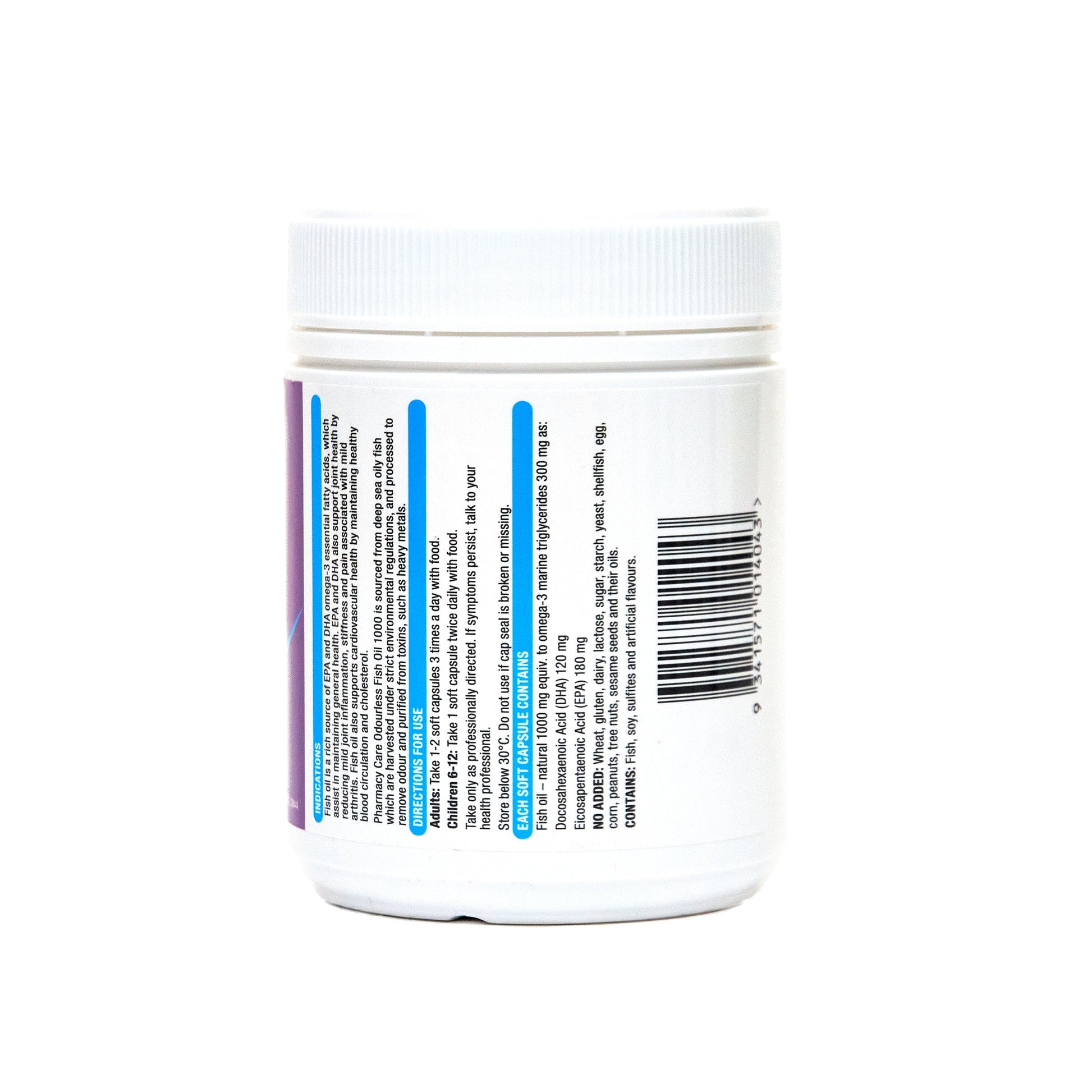 Research has shown the Omega 3 fatty acids found primarily in fish are essential nutrients which assist in supporting and maintaining good health. Specifically, eicosapentaenoic acid (EPA) and docosahexaenoic acid (DHA) found in Fish Oils play an important role in joint health, where they may improve mobility and decrease inflammation and pain associated with arthritis. Omega 3 fatty acids may also help to maintain a healthy cardiovascular system by supporting normal circulation, blood pressure and cholesterol in healthy individuals. We also need Omega 3 for healthy eyes and skin, and for central nervous system structures such as brain cells. Pharmacy Care Odourless Wild Fish Oil 1000 is sourced from premium deep sea oily fish; mackerel, sardines and anchovies that swim freely in the ocean and are only harvested under the strictest sustainability regulations.