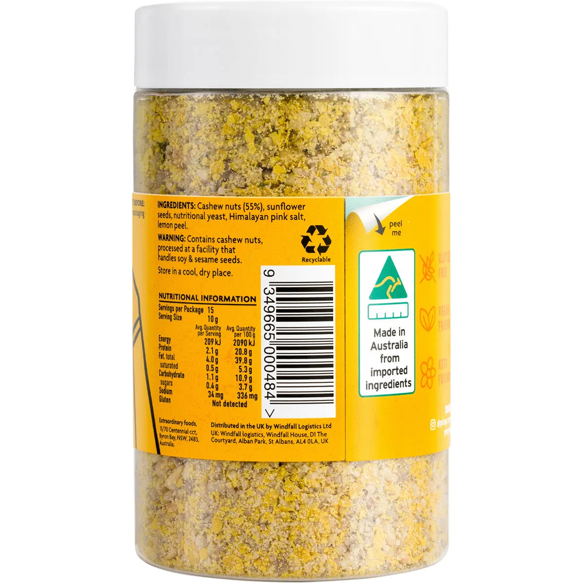 Cashew Nuts (55%), Sunflower Seeds, Nutritional Yeast, Himalayan Pink Salt, Lemon Peel.