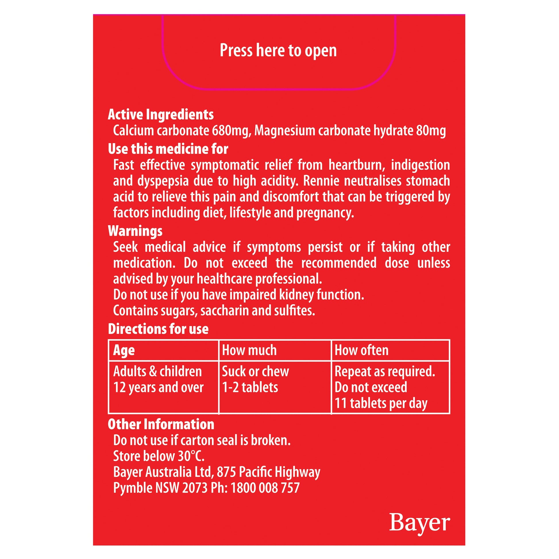 Rennie is an antacid that provides fast relief from indigestion, heartburn, acidity, upset stomach or dyspepsia. Rennie neutralises stomach acid to relieve the pain and discomfort.