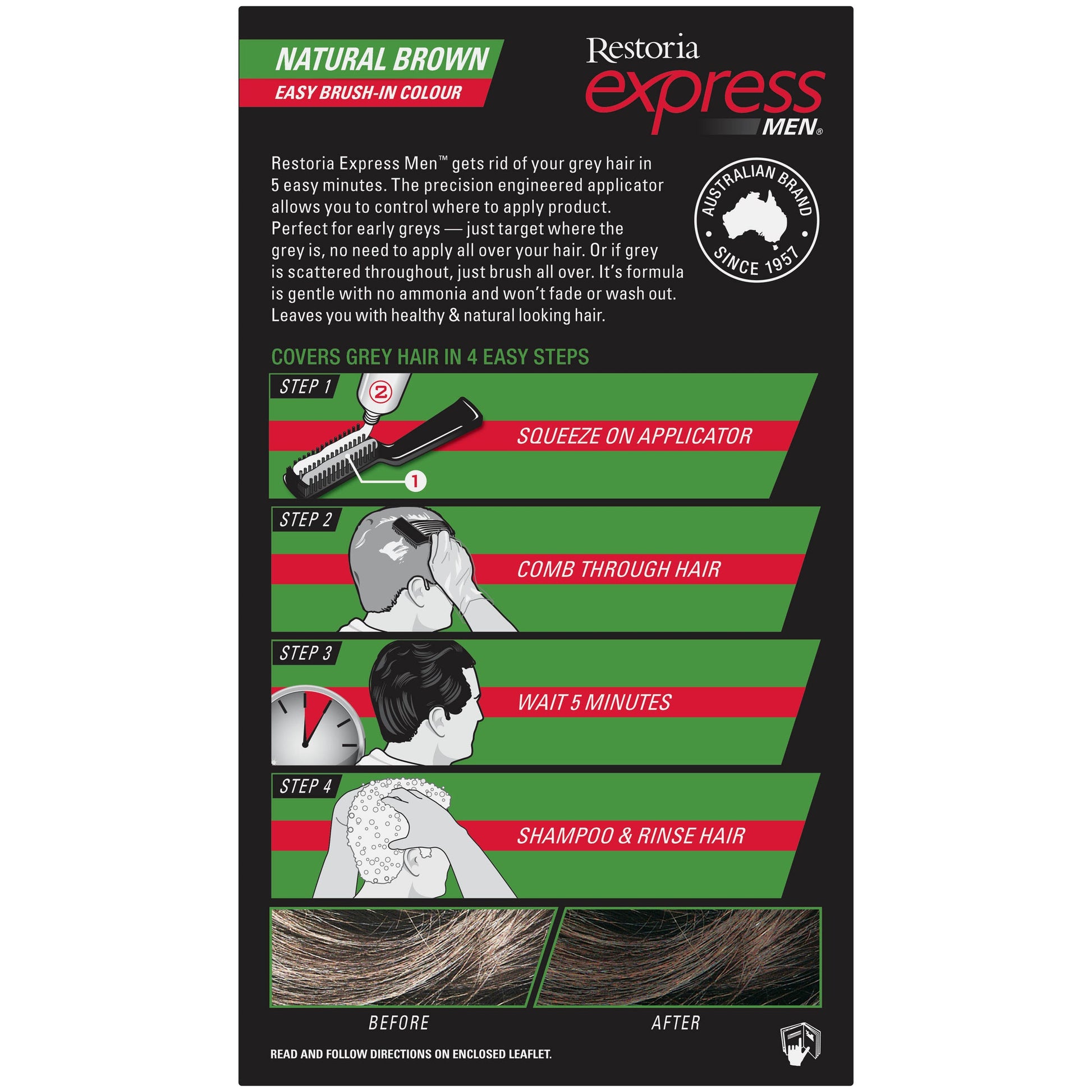 Restoria Express Men is engineered for men to be fast and easy to get rid of your grey. A quick 5 minute touch up session will keep away the grey and keep you looking and feeling your best self. Restoria Express Men is the no fuss solution to get rid of your grey hair at home. It provides 100% grey coverage that won’t fade or wash out and always leaves hair feeling thick, natural and healthy. Restoria Express Men includes a unique brush that makes application quick and easy, and a no-drip cream formula that prevents running or splatter. Now with resealable tubes, Restoria Express Men is economical as well. Simply do a touch up whenever grey hair appears. Restoria Express Men is also ideal for touching up greying hair on both the head, beard and sideburns. Available in 4 natural shades: Natural Brown, Dark Brown, Real Black, Jet Black.