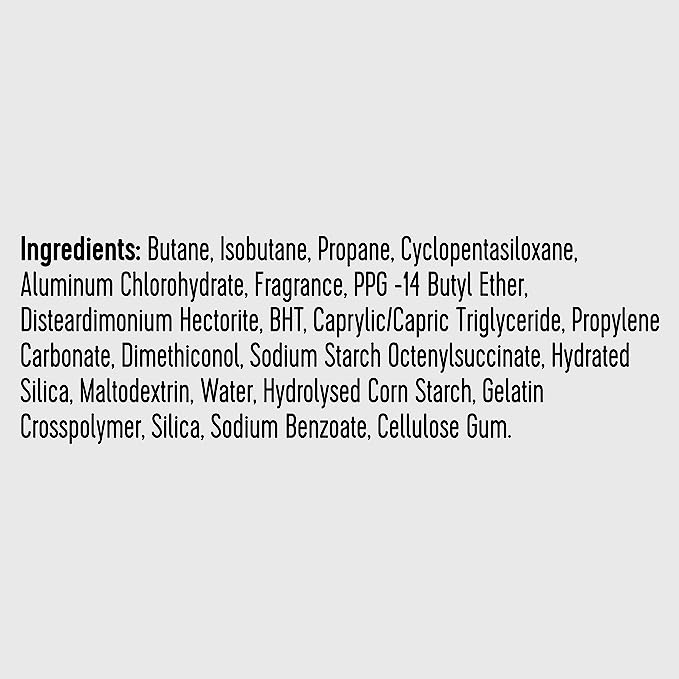 Butane, Isobutane, Propane, Cyclopentasiloxane, Aluminum Chlorohydrate, Fragrance, Ppg-14 Butyl Ether, Disteardimonium Hectorite, Bht, Propylene Carbonate, Dimethiconol, Caprylic/Capric Triglyceride, Hydrated Silica, Gelatin Crosspolymer, Water, Cellulose Gum, Sodium Benzoate, Sodium Starch Octenylsuccinate, Maltodextrin, Hydrolysed Corn Starch, Silica.